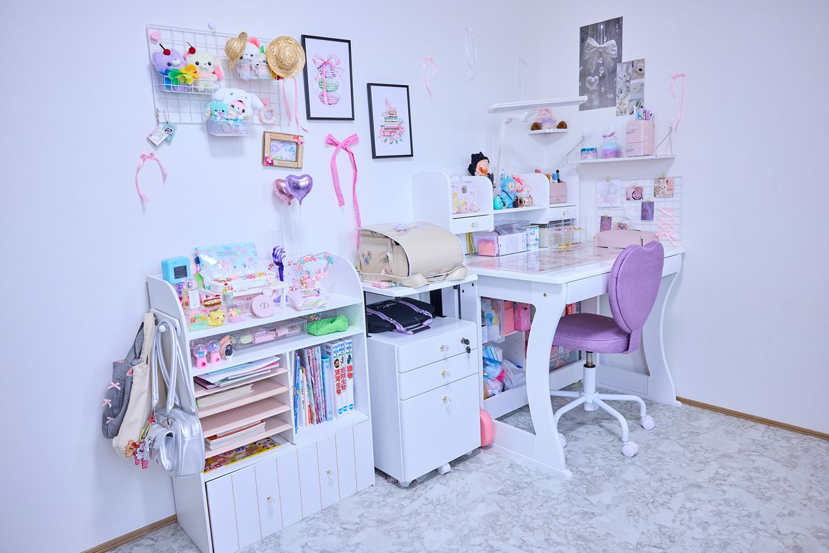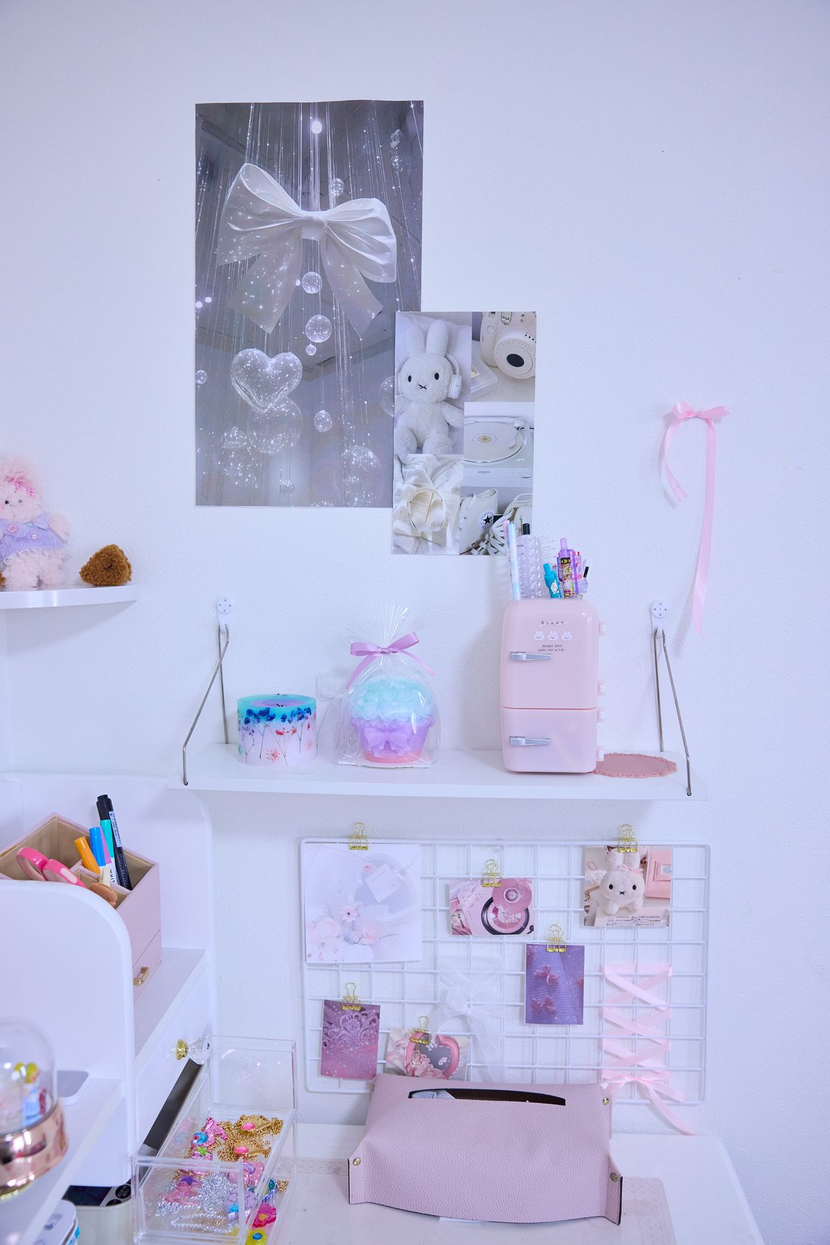 白が多め! カベにはかわいい絵やリボンをかざって、甘いふんいきをだしているところがお気に入りポイントです♡