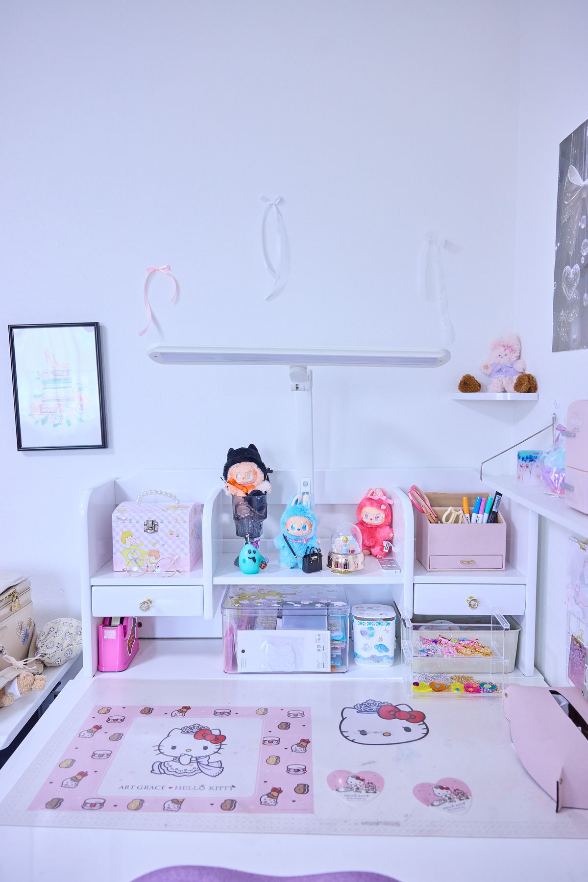 デスクまわりは、勉強に集中できるようになるべくシンプルに! ハマっているものをかざるエリアもあって、今はラブブ♡