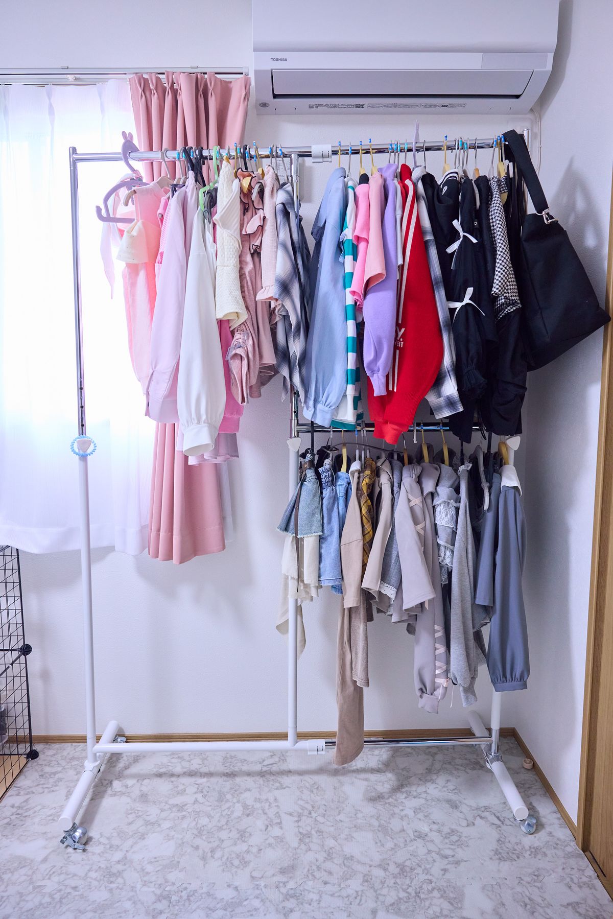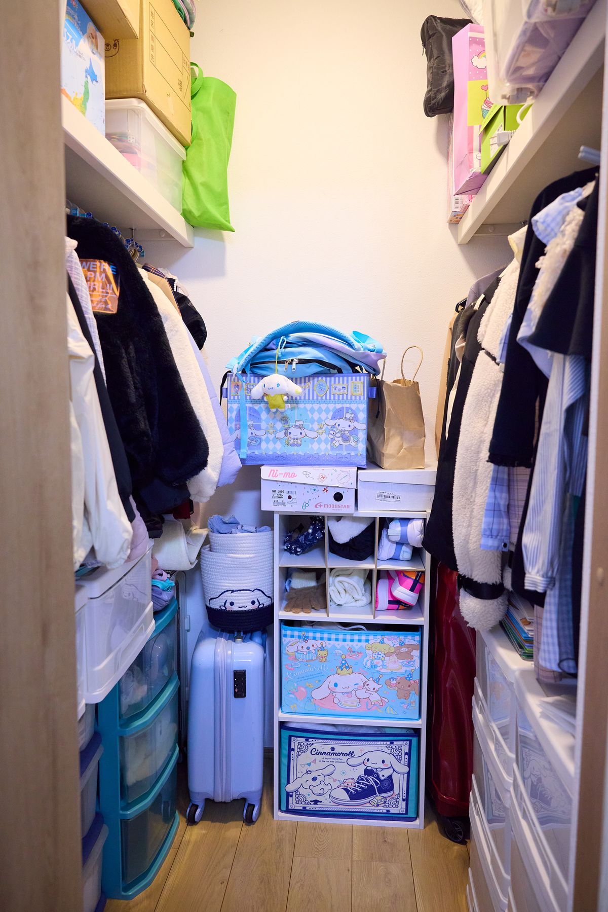 クローゼットを開けてもシナモンくんに会えるようにしてる♪ クローゼットに入らない服は、色別でラックにかざってるよ!