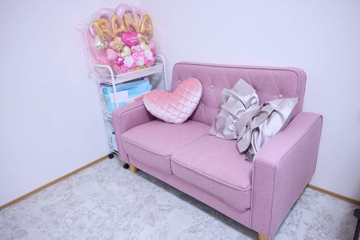 ソファースペースはリラックスできるように、シンプルめ。かわいいクッションを置いているのもこだわり!