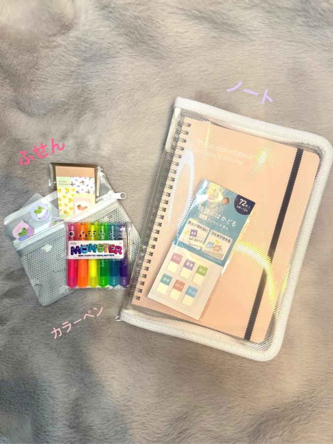 自主学習のときにマーカーで色分けするでしょ?筆箱のほかにペンを何本も持ち歩くと荷物になるから、このミニサイズのペンを付箋と一緒にケースに入れて、ノートと一緒にファイルにいれてチャックして持ち歩くようにしてるよ🌟monsterのカラーペンはPLAZAで買ったよ😊