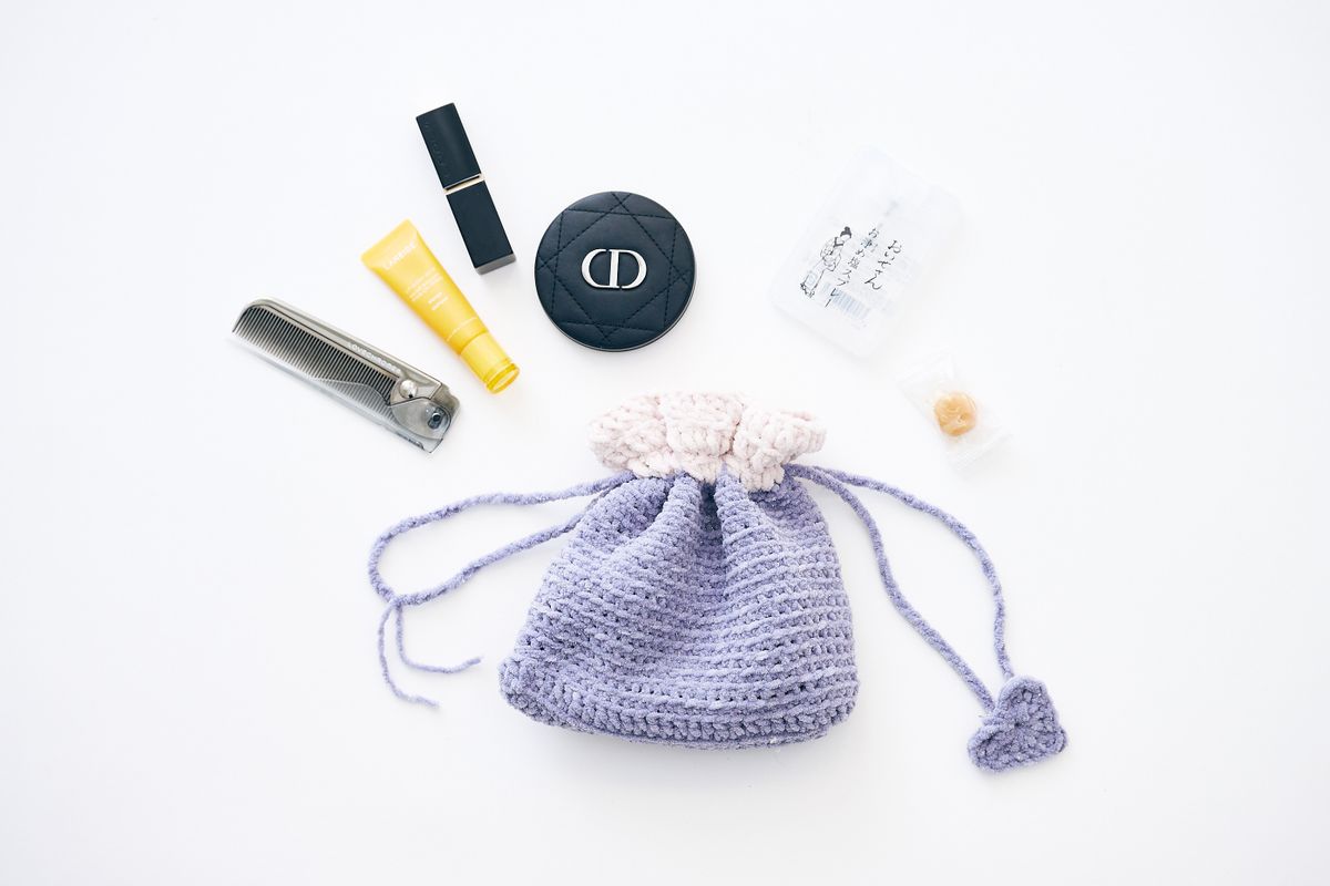 少し大きめの巾着が欲しくて自分で編みました! その中には、くし、リップ、ミラー、お清め塩スプレー、のど飴など! くしは、前髪やブラシの後にとかす用。リップは、保湿力があって、大好きなマンゴーの香り。SUQQUのリップは、最近オレンジにはまっています。お清め塩スプレーは、メンバーのKAREN ちゃんからもらった! 最近清めるものがほしくて、気になっていたのですごく嬉しかった♡ のど飴も、メンバーのKAREN ちゃんからもらいました! KARENちゃんの出身地、三重県のお土産ののど飴で、美味しくて必ずポーチに入れてます!