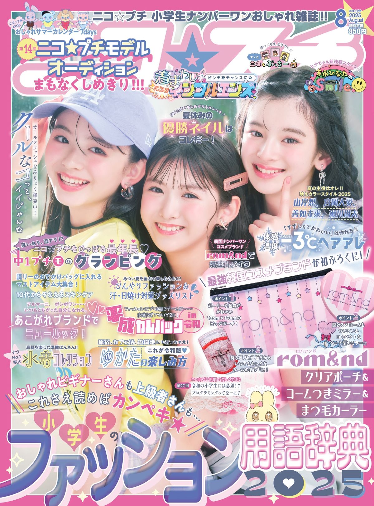ホノカとりむが初表紙をつとめた『ニコ☆プチ』2025年8月号♡ 浴衣や水着など、夏ならではのファッション企画も盛りだくさん☆ ふろくのロムアンドのクリアポーチ&コームつきミラー&まつ毛カーラーも、読者から大好評だったよ♪