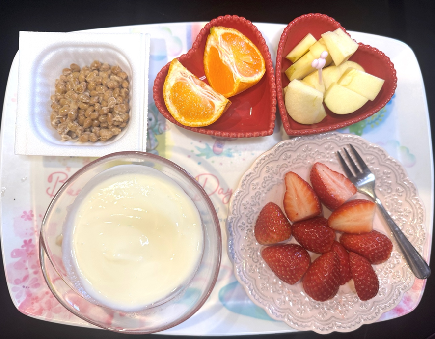 朝はフルーツを沢山食べて、発酵食品の納豆とヨーグルトは必須! 美容には、腸内環境が一番だいじっ♡ その後ピアノの練習をして、でかける準備をするよ。