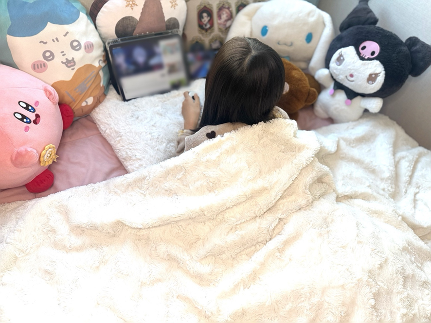 お休みの日はお布団でダラダラするのが最高! いとこのお兄ちゃんとオンラインでマイクラをしたり、YouTube見ながらダラダラしているよ。