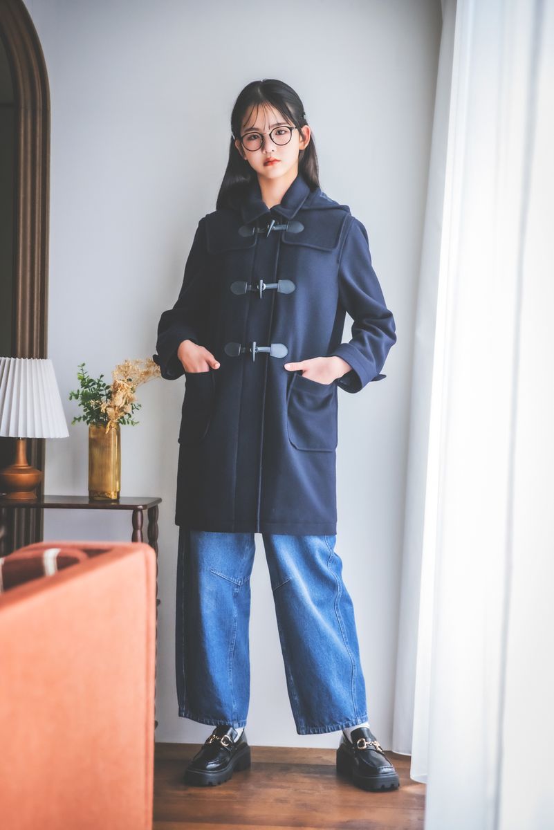 カジュアルなストレートデニムに、ダッフルコートを投入すると紳士的なフンイキへチェンジ! アクセントでメガネをかけて知的な女のコっぽく見せるのもアリ☆
