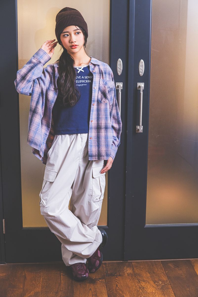 きっちりチェック柄シャツは羽織っても腰に巻いても超クール! カーゴパンツとニット帽でコンビを組んだらさわやかなスポカジへ変身♡