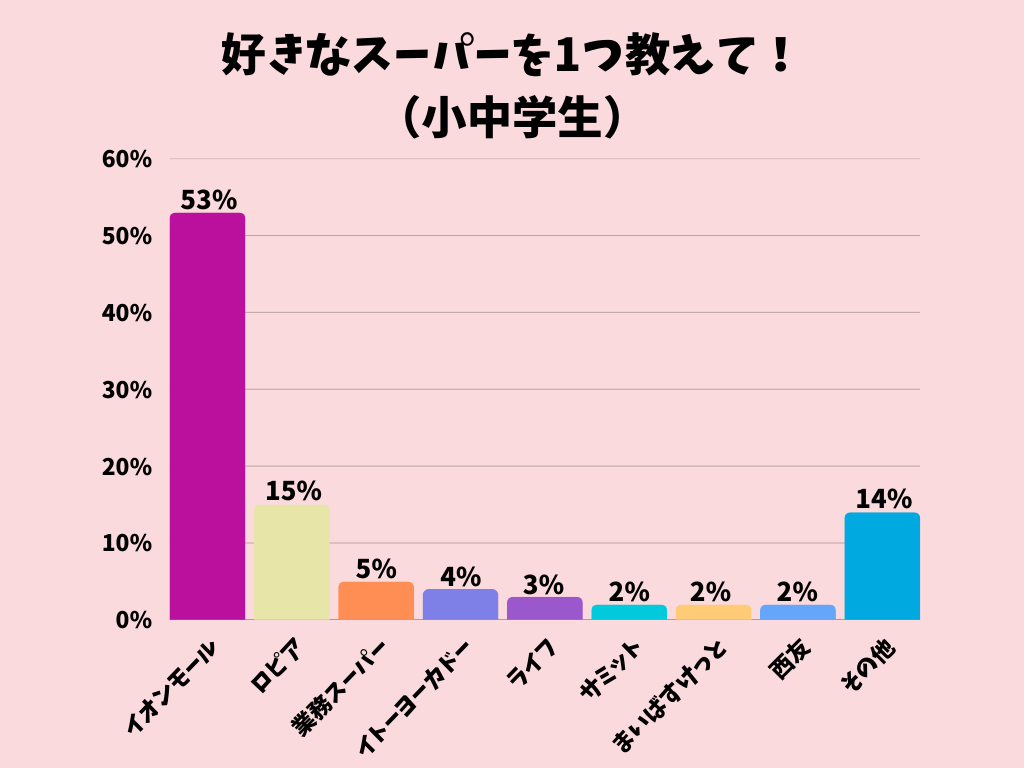好きなスーパーの1位はイオンモールで、半数以上が支持する結果に。フードコートやエンタメ要素などがあり、長い時間楽しめる魅力が大きいようです。ロピアや業務スーパーなど、価格やボリューム感を重視して選ぶスーパーもランクインしていました。