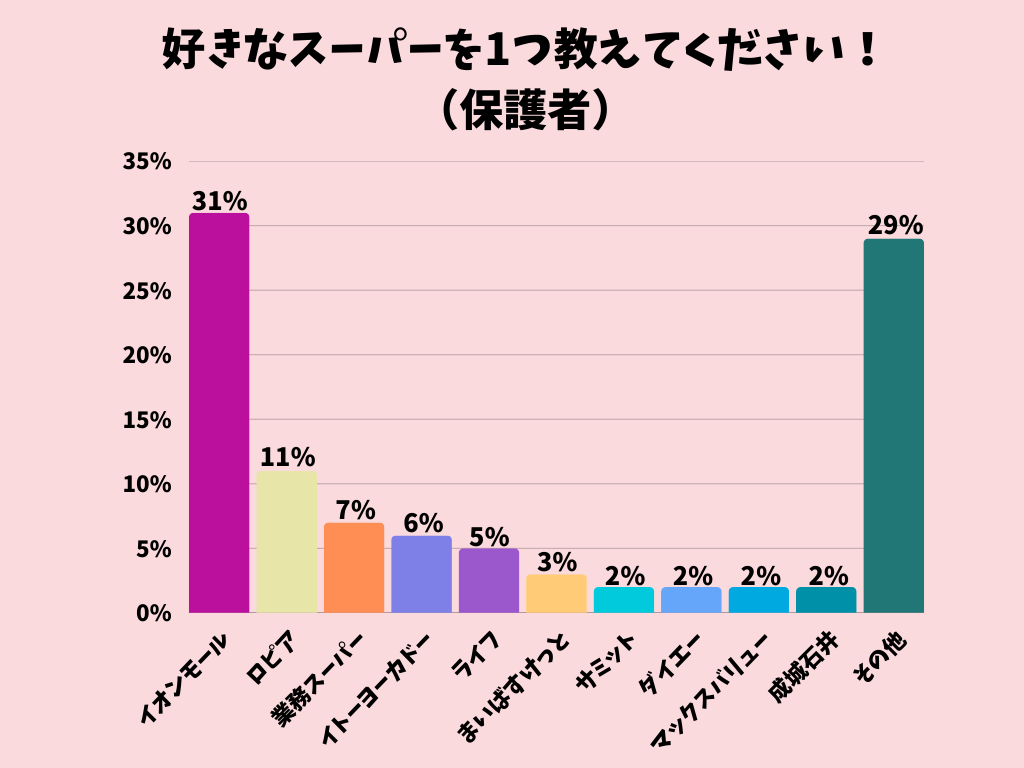 保護者でも、イオンモールが1位に。ティーンよりも支持率は下がるものの、「家族で行きやすい」「まとめ買いがしやすい」といった理由から人気を集めています。グラフに挙がっているスーパー以外にも、地域密着のスーパーが幅広く利用されている印象でした。