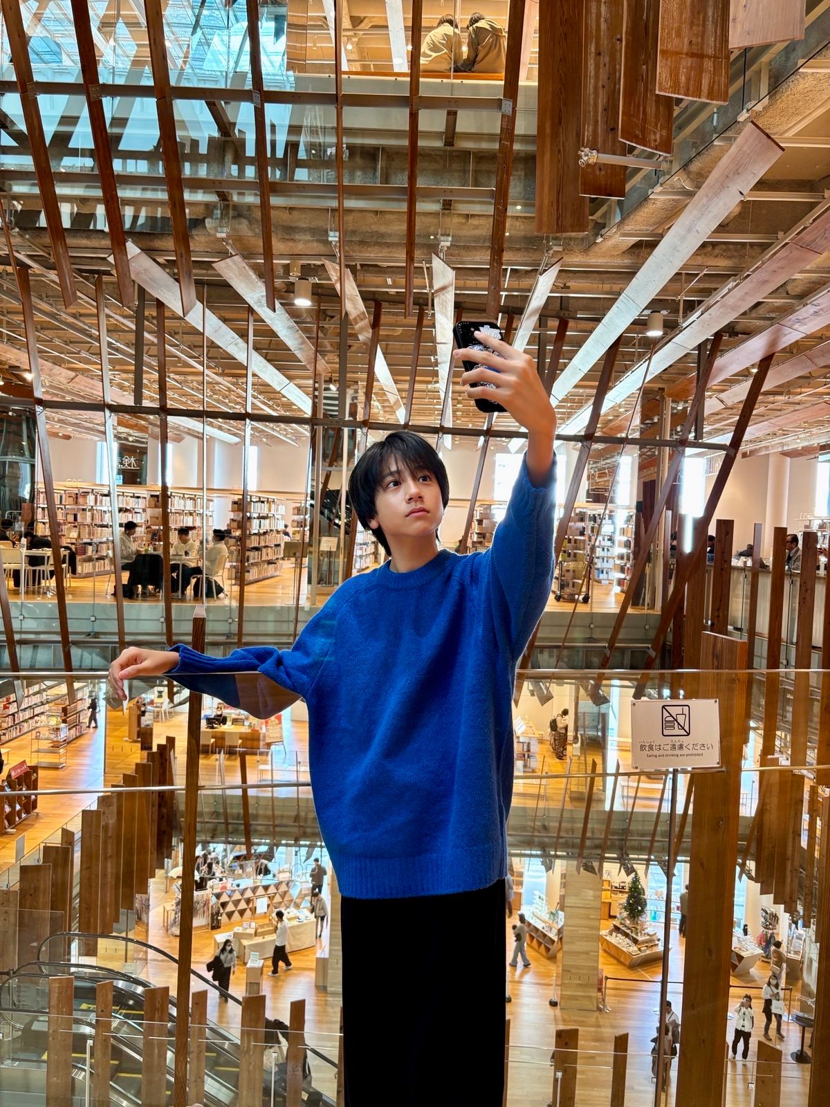 富⼭市⽴図書館に⾏ったときの写真です! 開放感ある館内をバックに、ちょっとだけモデルを意識した⾃撮りをしている写真です! ブルーのニットが映えて、いい感じかなーって気に⼊ってます!年末のごあいさつ