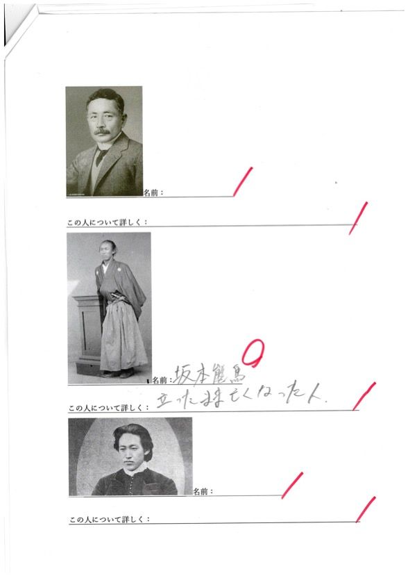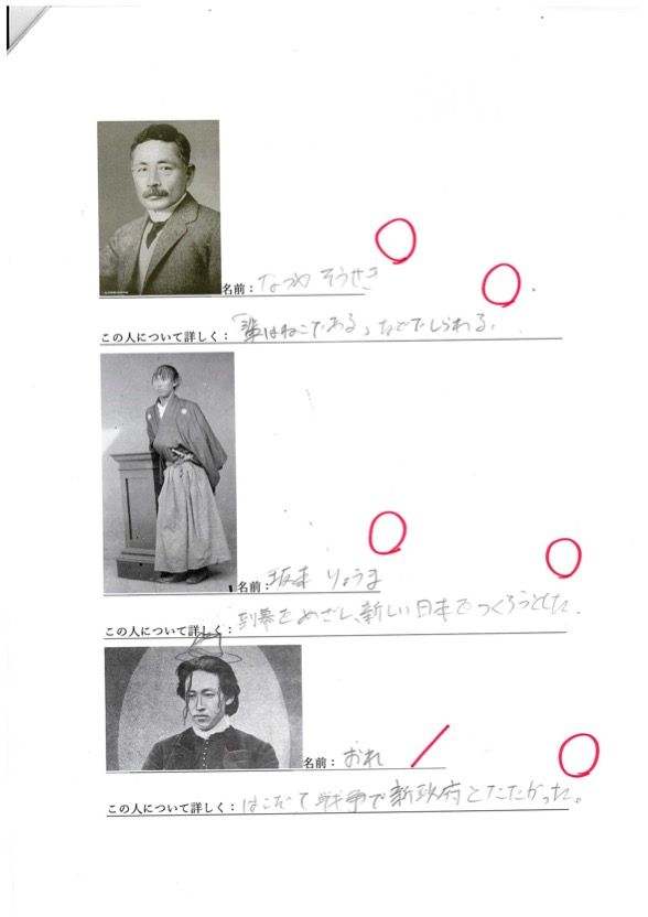 歴史上の人物に落書きをするツカサ。どうしても土方歳三を思い出せなくて、”おれ”と記入(笑)。