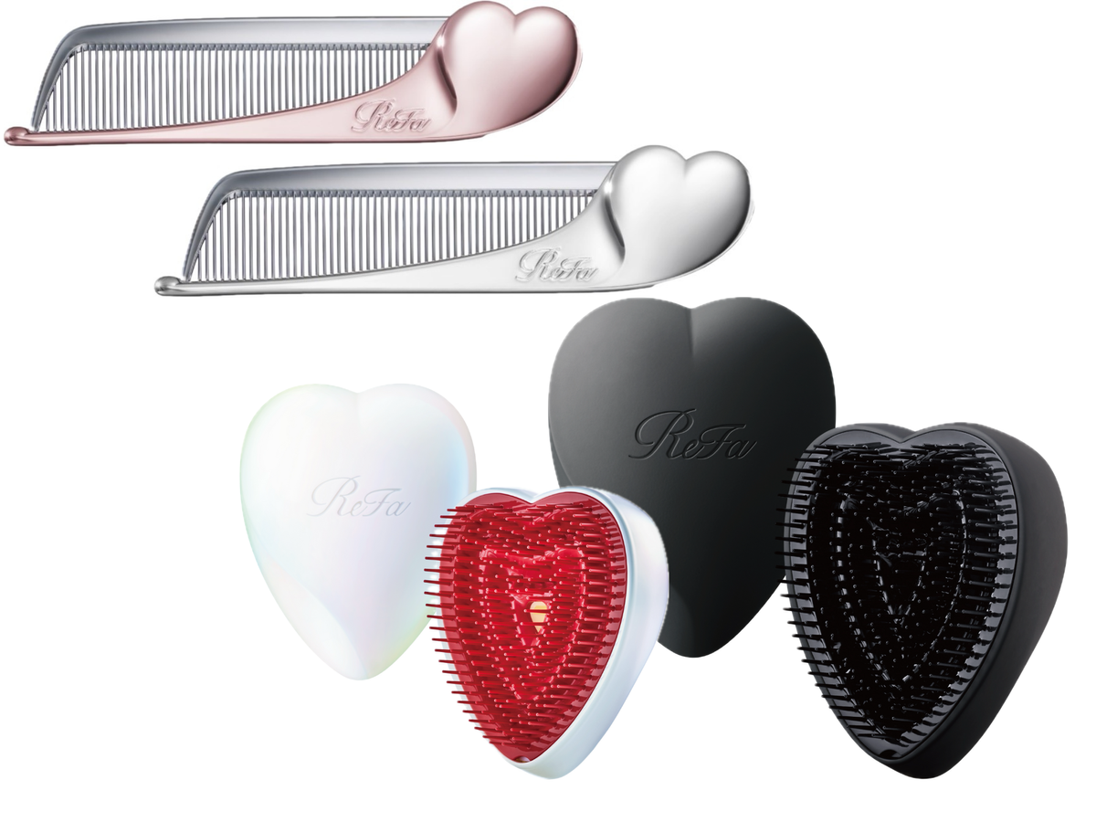 広がった髪をほぐしながらツヤをあたえてくれるよ。ころんとしたハートにキュン♡ リファハートブラシ[写真右下・左から]オーロラホワイト、マットブラック各¥2970/ともにエムティージー