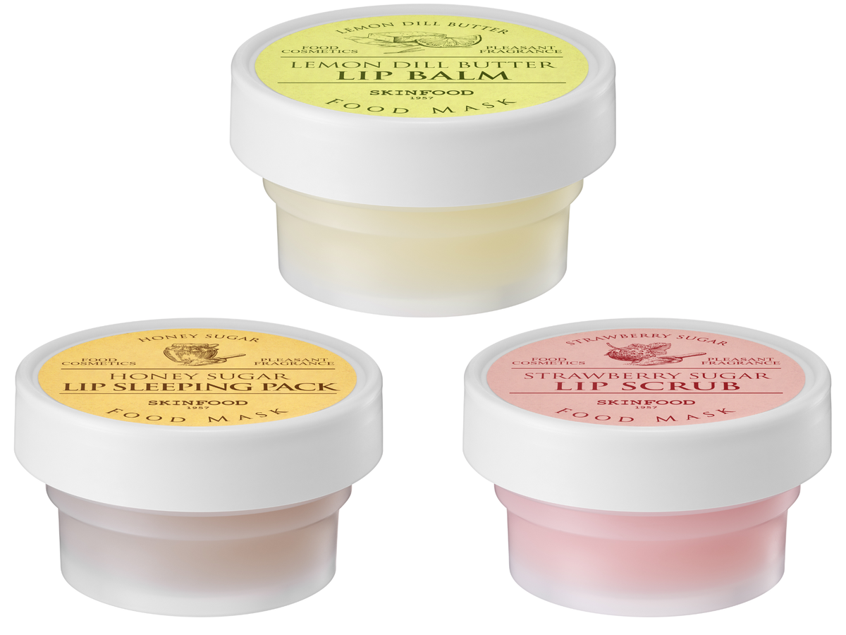 冬のおこもり美容におすすめなのは、じつは大事なリップケア♡ [上から時計回りに]レモンディルバター フードマスクリップバーム、ストロベリーシュガー フードマスク リップスクラブ、ハニーシュガー フードマスク リップスリーピングパック各¥1485/すべてフードコスメ
