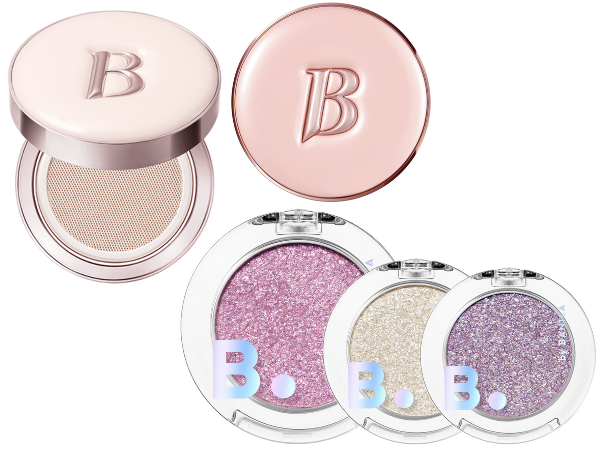 [左から時計回りに]バニラコ エッセンス スキン ピンククッション 19、バニラコ エッセンス スキン デュースキンクッション19各¥2970、バニラコ ハイパーホロビームアイグリッター各¥1300/すべてモノック