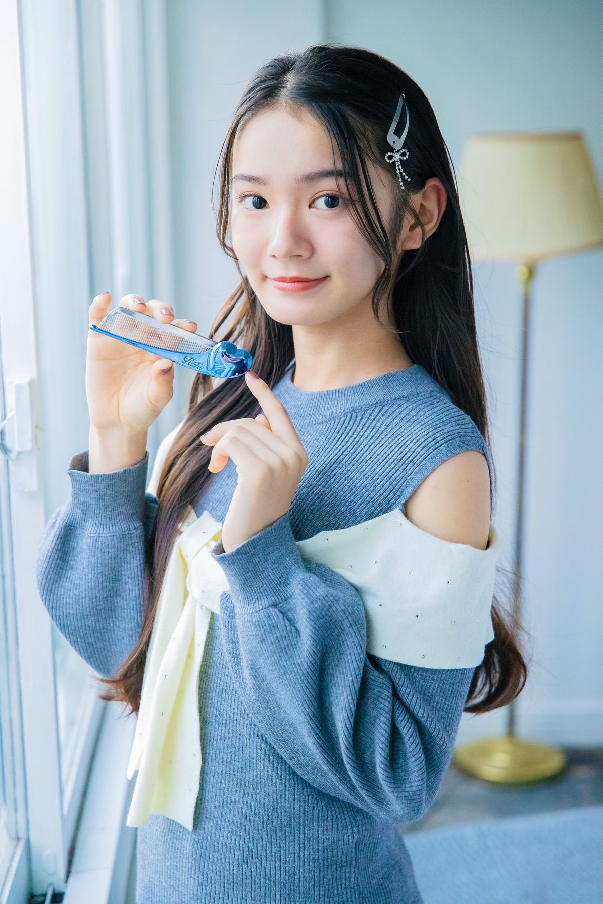アンナ☆リファハートコーム アイラ アクアブルー¥2970/エムティージー ニット¥4900/ブルーデイジー(ホープス) ヘアピン(2個セット)¥880/SPINNS