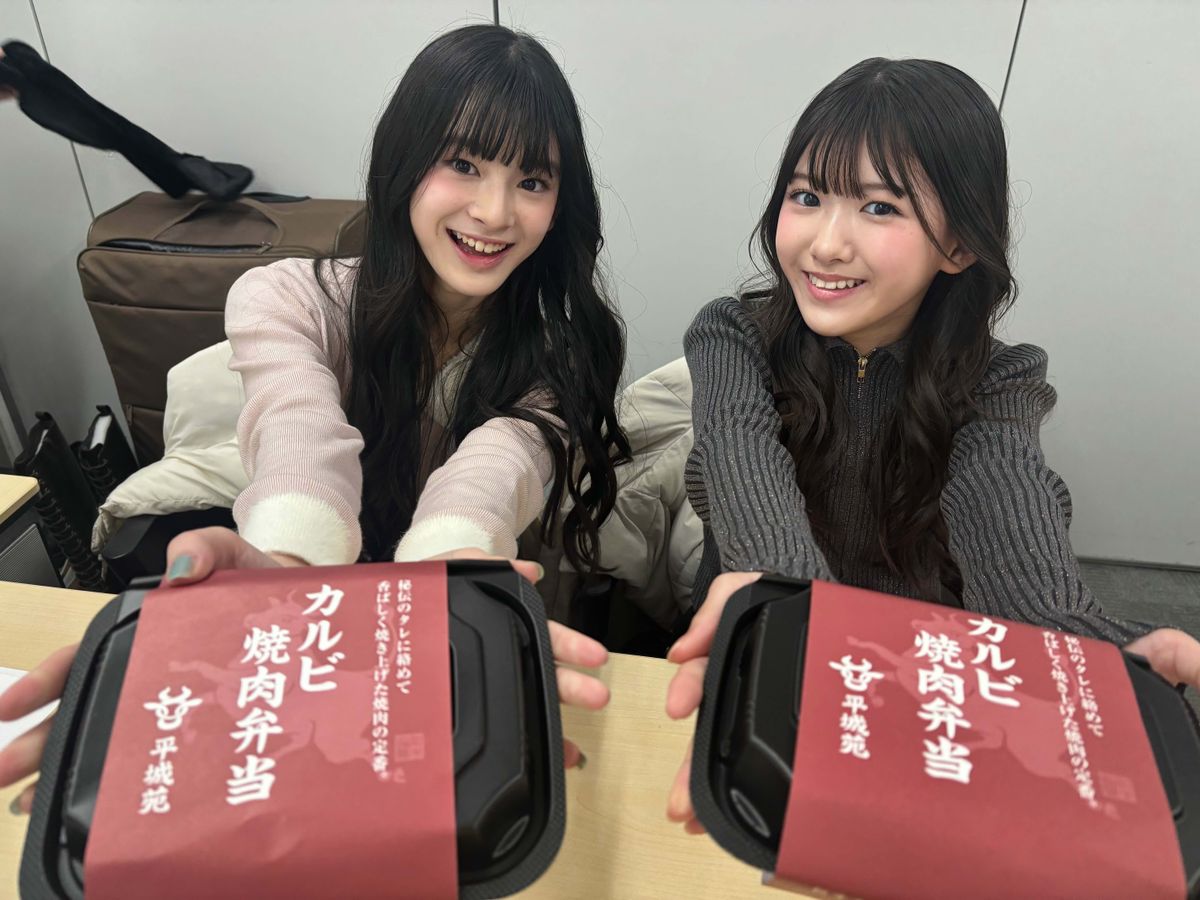 なんとランチは、出来立てホヤホヤの焼肉弁当だったの♡ テンションが上がるヒナちゃんとりむをパシャリ! イベント前にしっかりエネルギーチャージをして準備もバンタン☆
