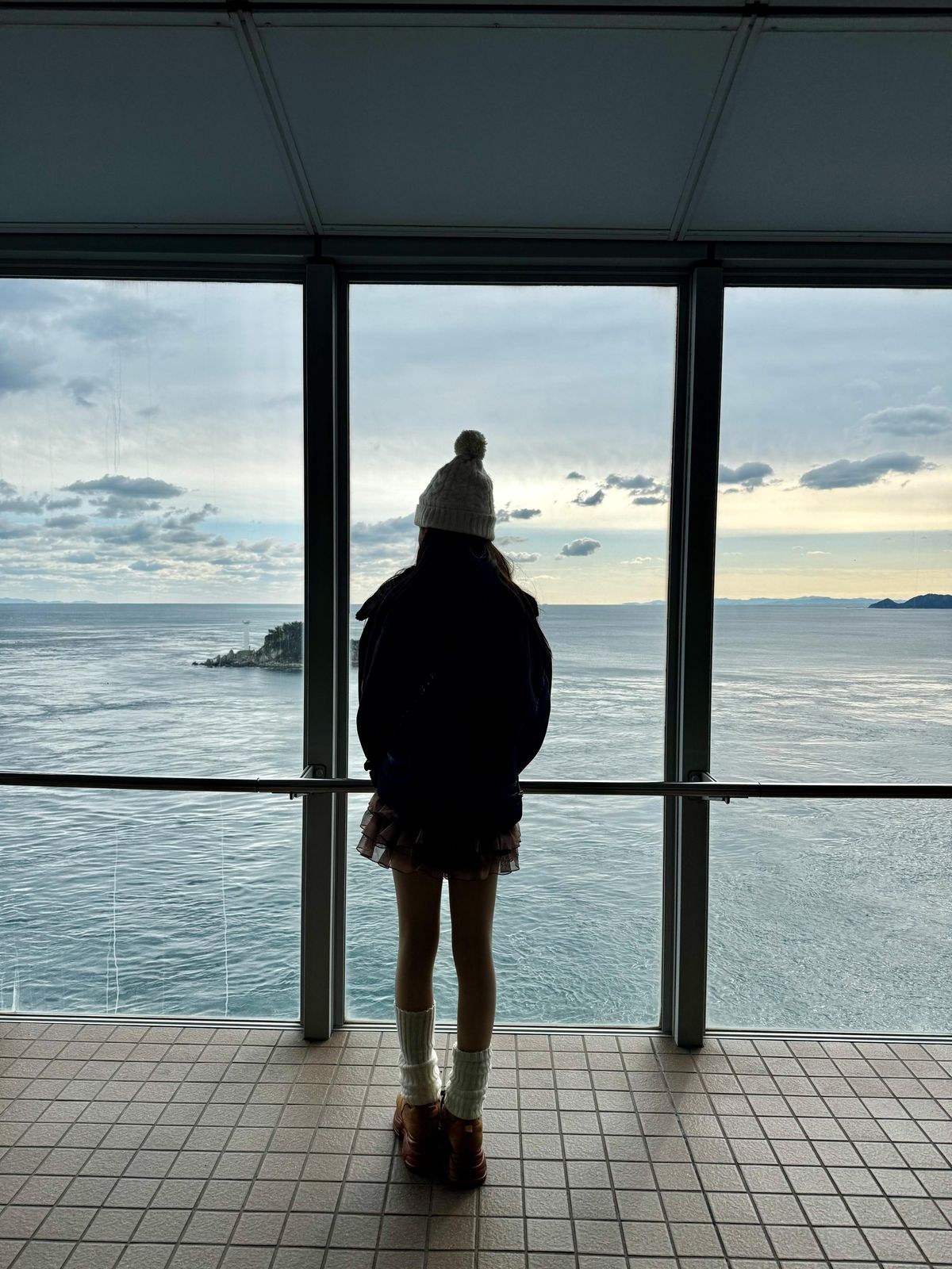 旅行の帰りに足を伸ばして徳島県まで行きました✨鳴門の渦の道と言うところに行ってきたんだけど、ここは渦を巻いてるところが見えるよ🌀ガラス窓で下が見れるところがあって、スリル満点でした🥹最初は怖かったけど、歩いてたらだんだん慣れてきたよ👍🏻