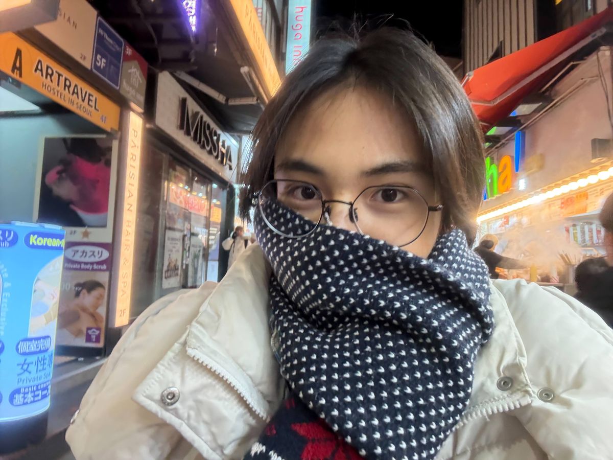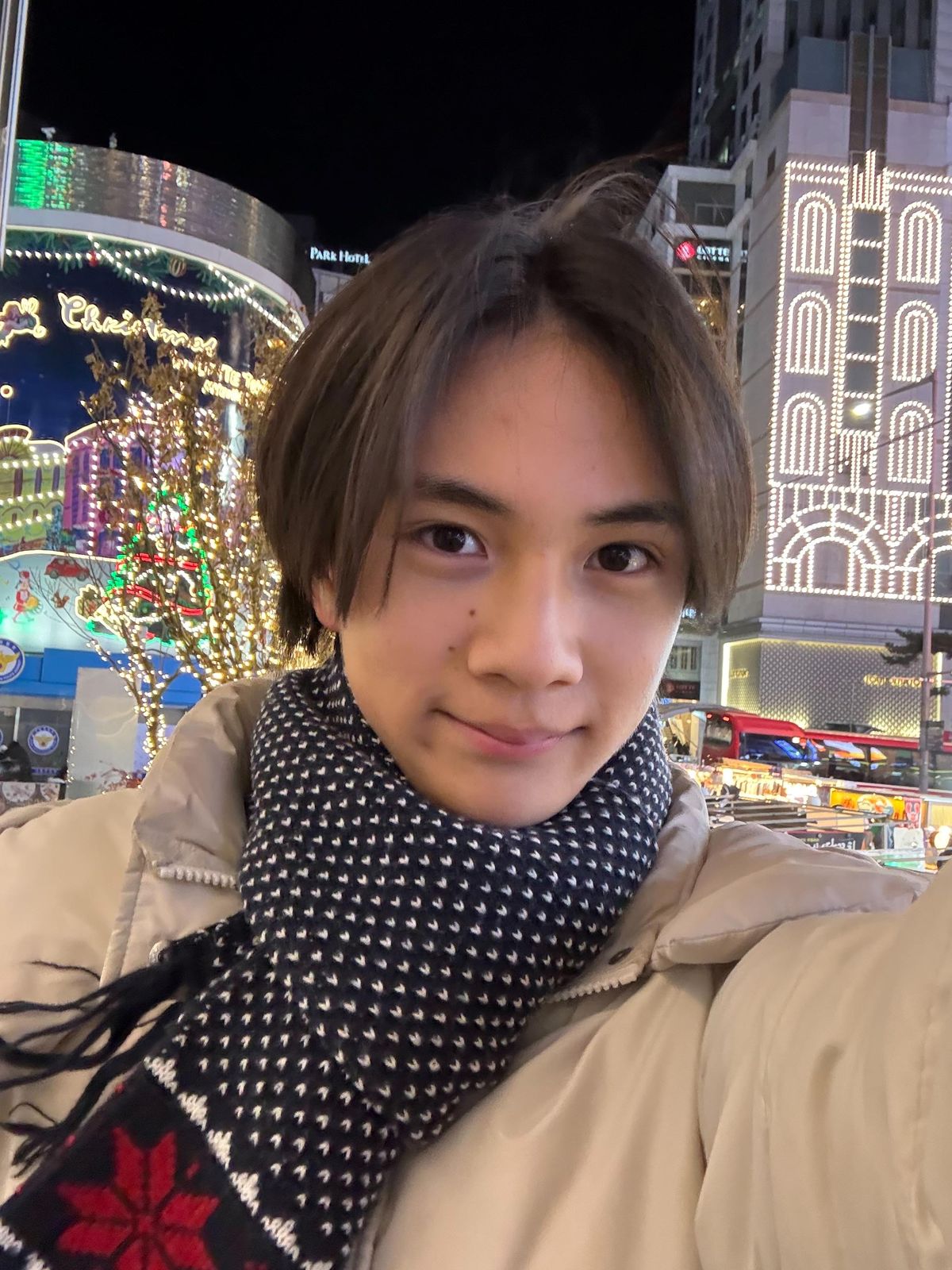 紺色のマフラーは祖母にもらったもので、雪の結晶❄️の模様が、首に巻くだけで一気に冬っぽい雰囲気を出してくれて、どんなアウターにもマッチしてくれて最高です🤩