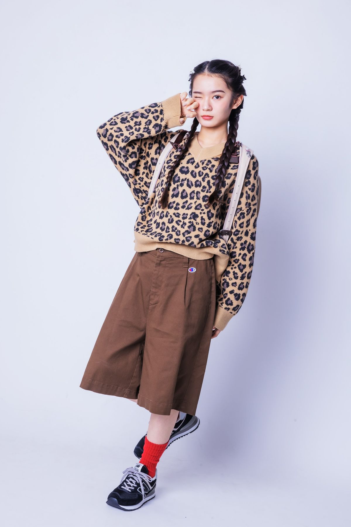 トレンドのヒョウ柄ニットは、やんちゃなハーフパンツを合わせてバランス調節! スポーツブランドを取り入れればより今っぽい!アンナ☆ニット¥5990/Gap※一部店舗のみ販売 ハーフパンツ ¥8690/チャンピオン (ヘインズブランズ ジャパン) ヘアクリップ (4個セット)¥330/パリスキッズ原宿本店 ソックス¥1100/靴下屋(タビオ) スニーカー¥12980/ニューバランス ランドセル ¥69300/ふわりぃランドセル