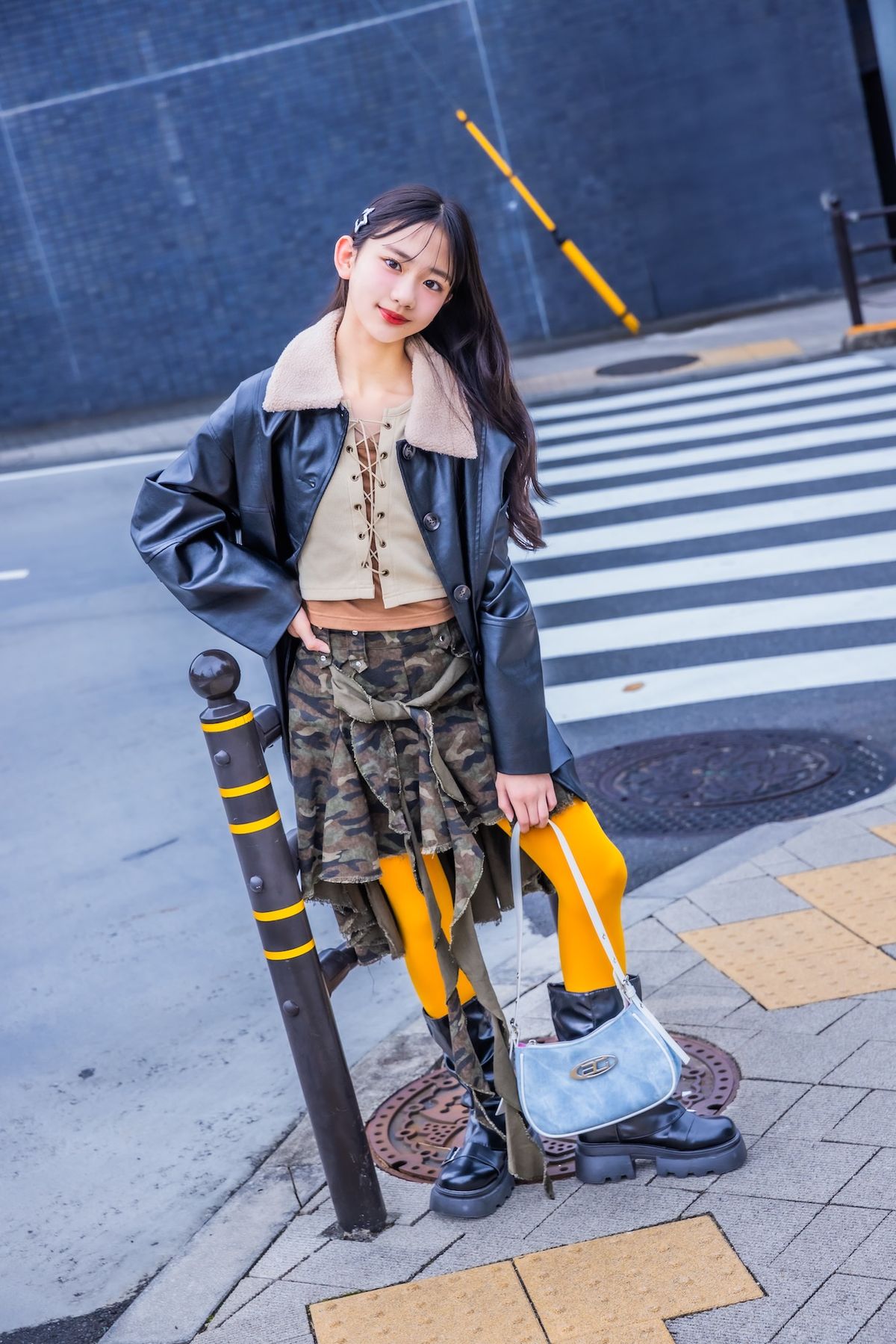 ひらひら迷彩スカートが目をひく☆ ワイルドな感じを出しつつ、カラータイツであそんじゃうのが一流のおしゃれさん。ちひな☆ジャケット¥6600/高速ターミナル 原宿店 トップス¥4290、バッグ¥4620/ともにアナップガール スカート¥4389、ヘアピン¥550/ともにSPINNS タイツ¥1210/靴下屋(タビオ) ブーツ ¥3980/URBAN CHERRY