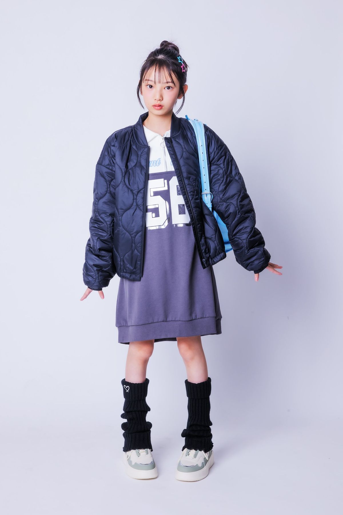 そんざい感高めのロゴ&ハーフジップが映える! レッグウォーマーでギャルっぽさを出せば、クラスの人気者☆もも☆ジャケット¥12900/GapKids ※一部店舗のみ販売 ワンピース¥4620/ピンク ラテ ヘアピン(6個セット)¥330/パリスキッズ原宿本店 レッグウォーマー¥2750/バイ ラビット スニーカー¥8800/ORTR(ダブルエー) ランドセル¥69300/ふわりぃランドセル
