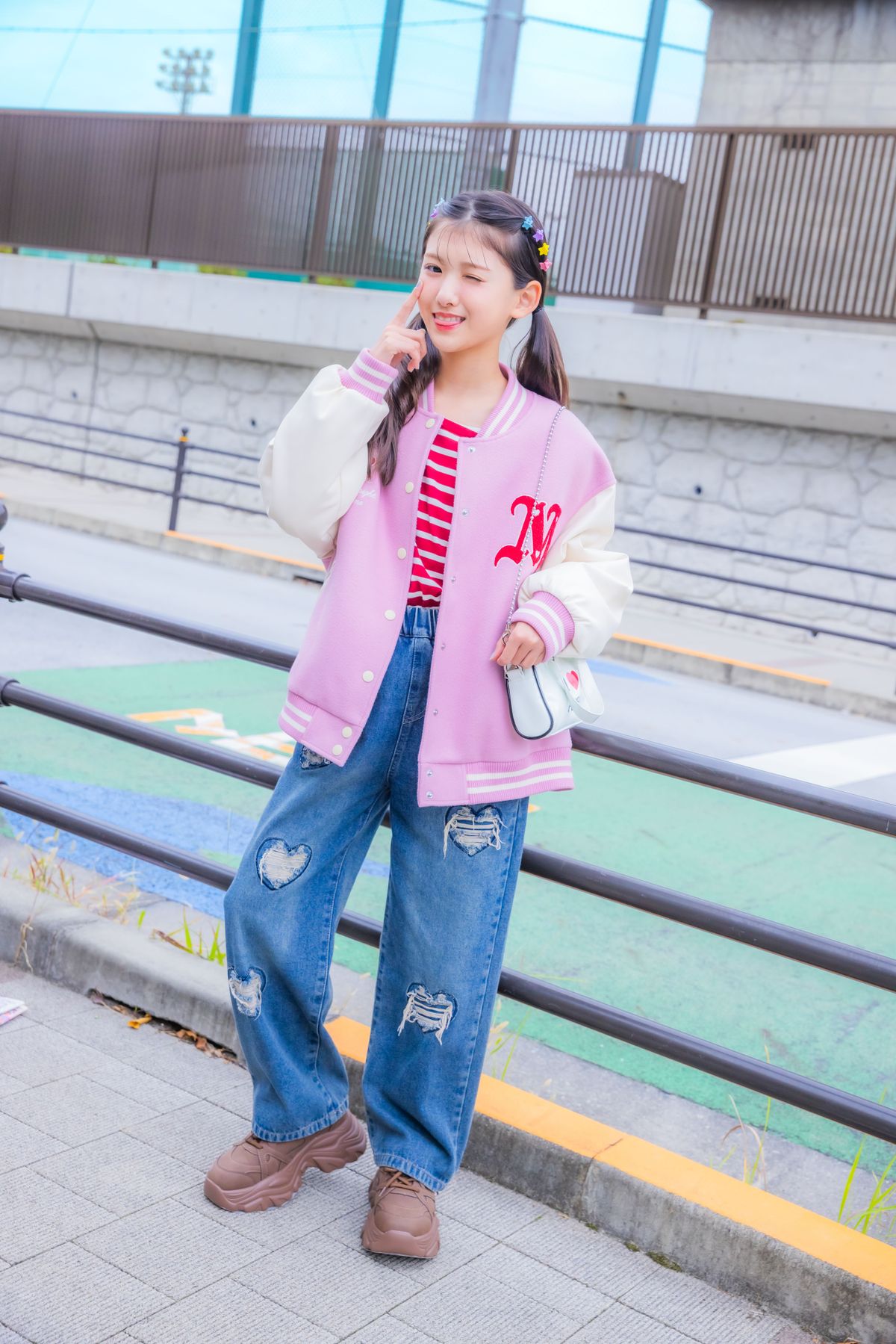 ハートにボーダー、ワクワクするモチーフをちりばめて☆ スタジャンとデニムの王道コンビで動きやすさもバッチリ!りむ☆スタジャン¥27500/メゾピアノ ジュニア トップス¥20900/プチバトー デニムパンツ¥3590/URBAN CHERRY ヘアクリップセット¥330/パリスキッズ原宿本店 バッグ ¥4620/アナップガール スニーカー¥4950/ギャレッツ渋谷109店