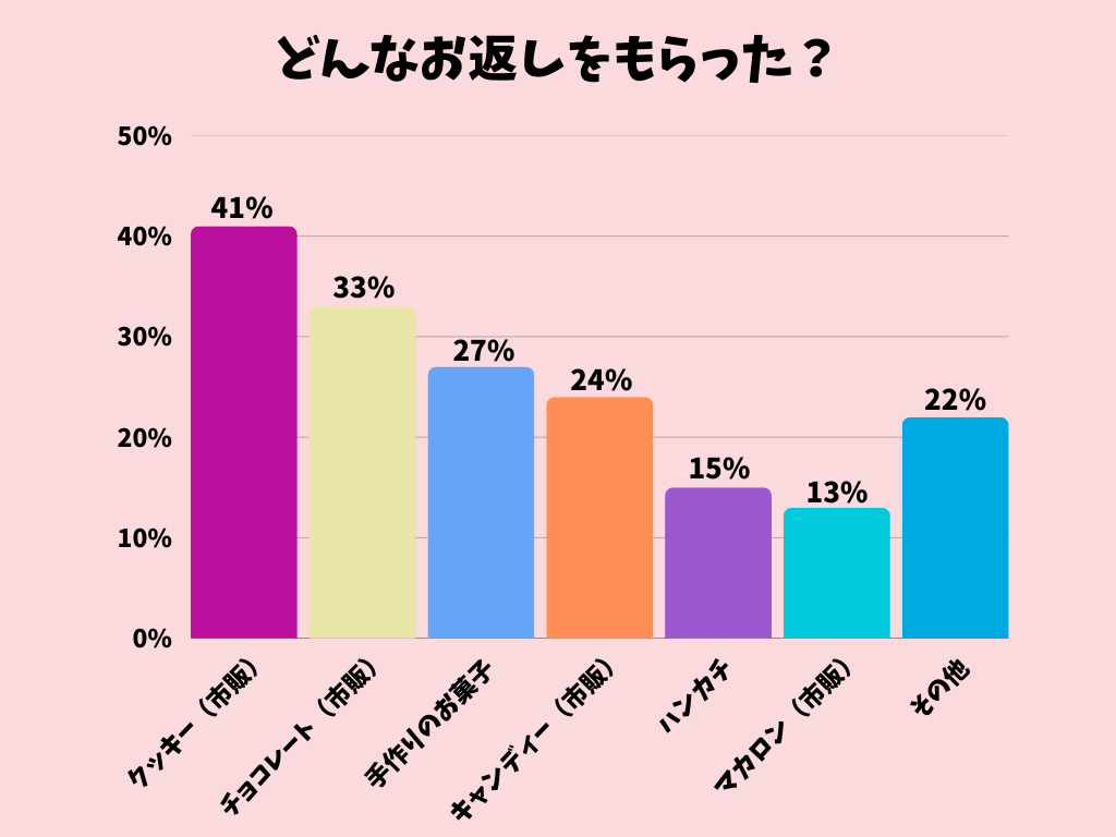 お返しは市販のクッキーやチョコレートが中心でした。「その他」では、文房具という回答が多く、ハンカチなどとあわせて実用的なアイテムも挙がりました。相手に気を遣わせすぎない、ちょうどいい距離感のお返しが選ばれている印象です。