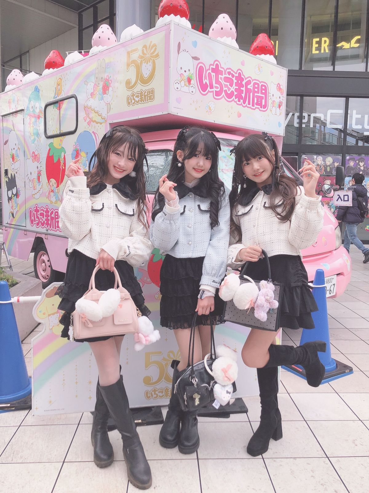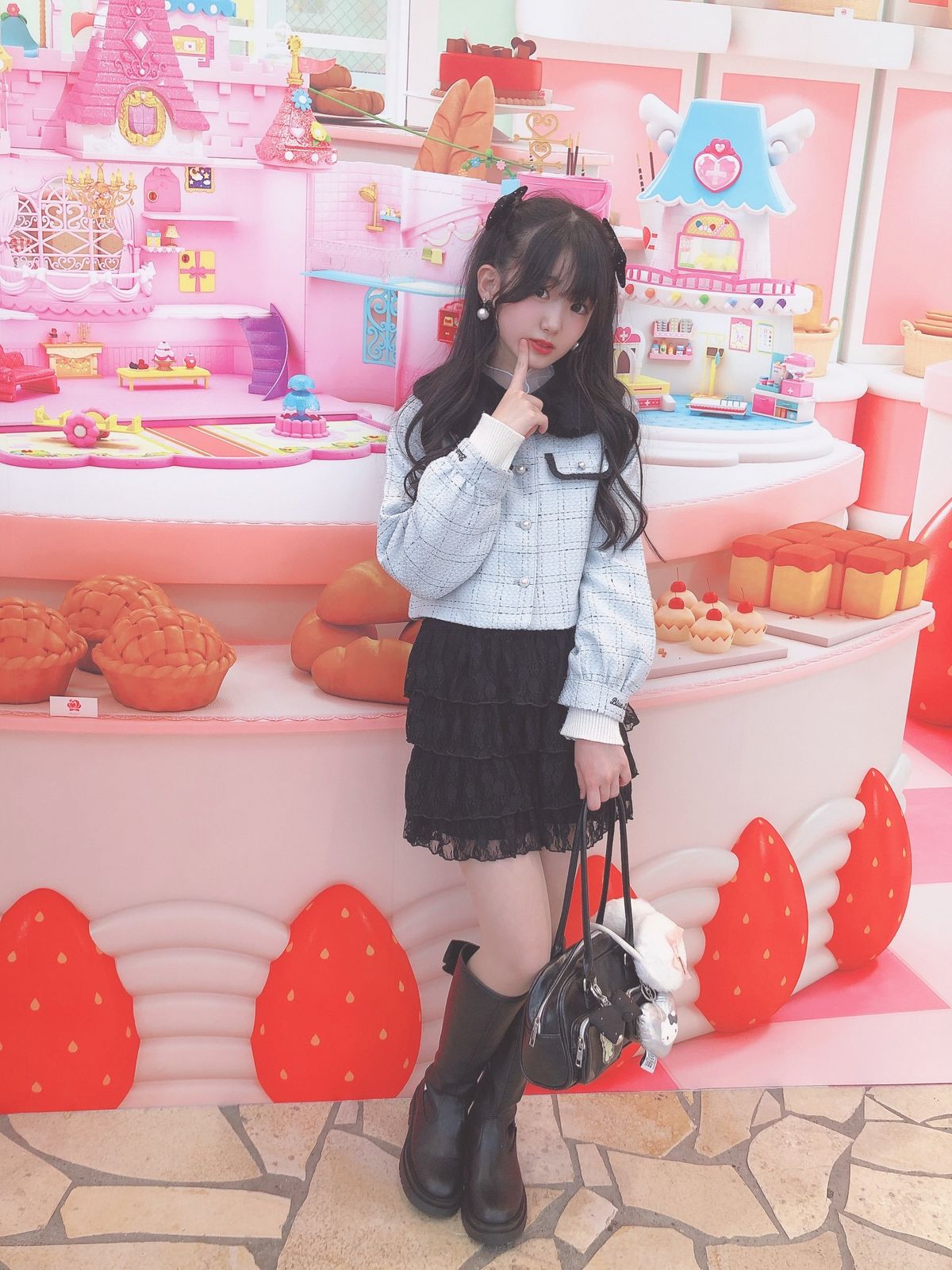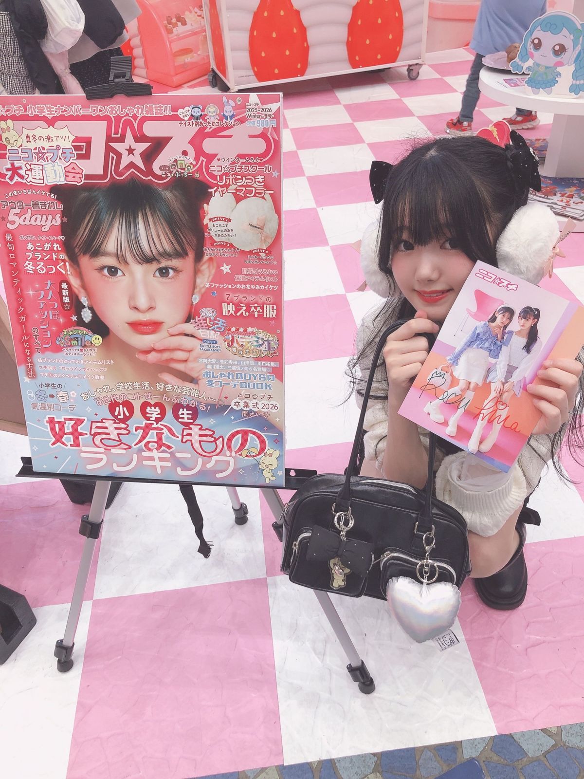 仲良しのゆいみんとルナちゃんとブルデのツイードジャケット合わせで参加したよ🌼🩵ニコ☆プチ冬号ふろくのイヤーマフラーをバッグにつけるの可愛いくない?🎀