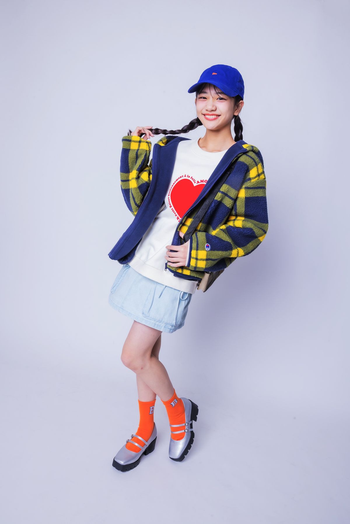 たくさん色を使う時はトーンを合わせるのがポイント。チェック柄のフリースアウターでプレッピーなふんいきをプラス!ちひな☆ボアブルゾン¥15180/チャンピオン(ヘインズブランズ ジャパン) スウェット¥23100/プチバトー スカート¥2790/アムリールガール キャップ¥4620/ニューエラ バッグ¥429/サンキューマート ソックス¥990/靴下屋(タビオ) シューズ¥8800/オリエンタルトラフィック(ダブルエー)