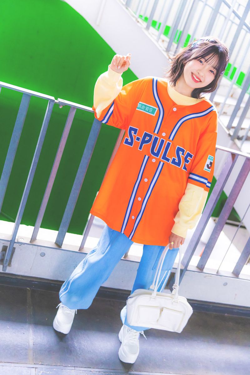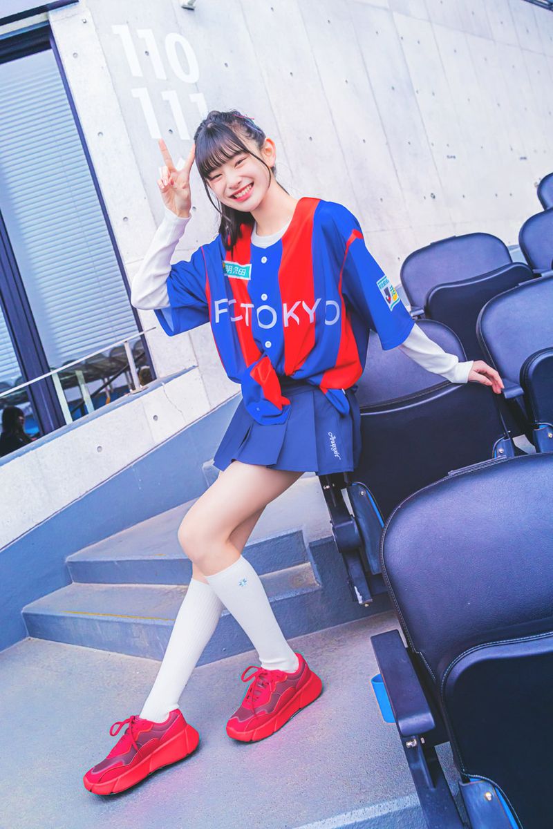 ベースボールシャツのボタンはしめ切らずに下を数個開けて、前しばりアレンジ! ユニのネイビー合わせのプリーツスカートと、赤に合わせたスニーカーで応援モチベ爆上がり↑