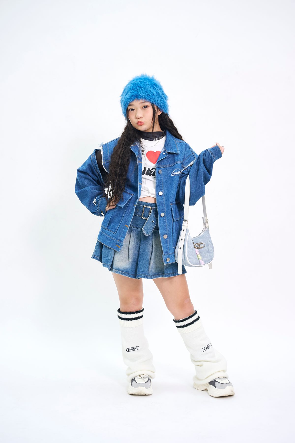 全体をブルー×デニムでまとめたストリートガーリー。肌見せや白小物でぬけ感をいしきしたよ♪