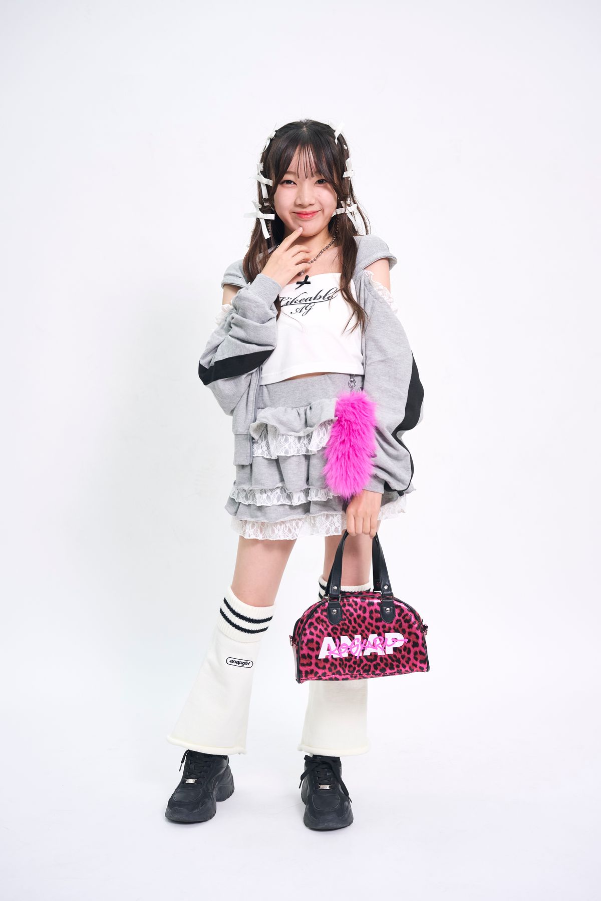 セットアップはスウェットなのに肌見せ&フリルやレースたっぷり! さし色のピンクも効いてる♪