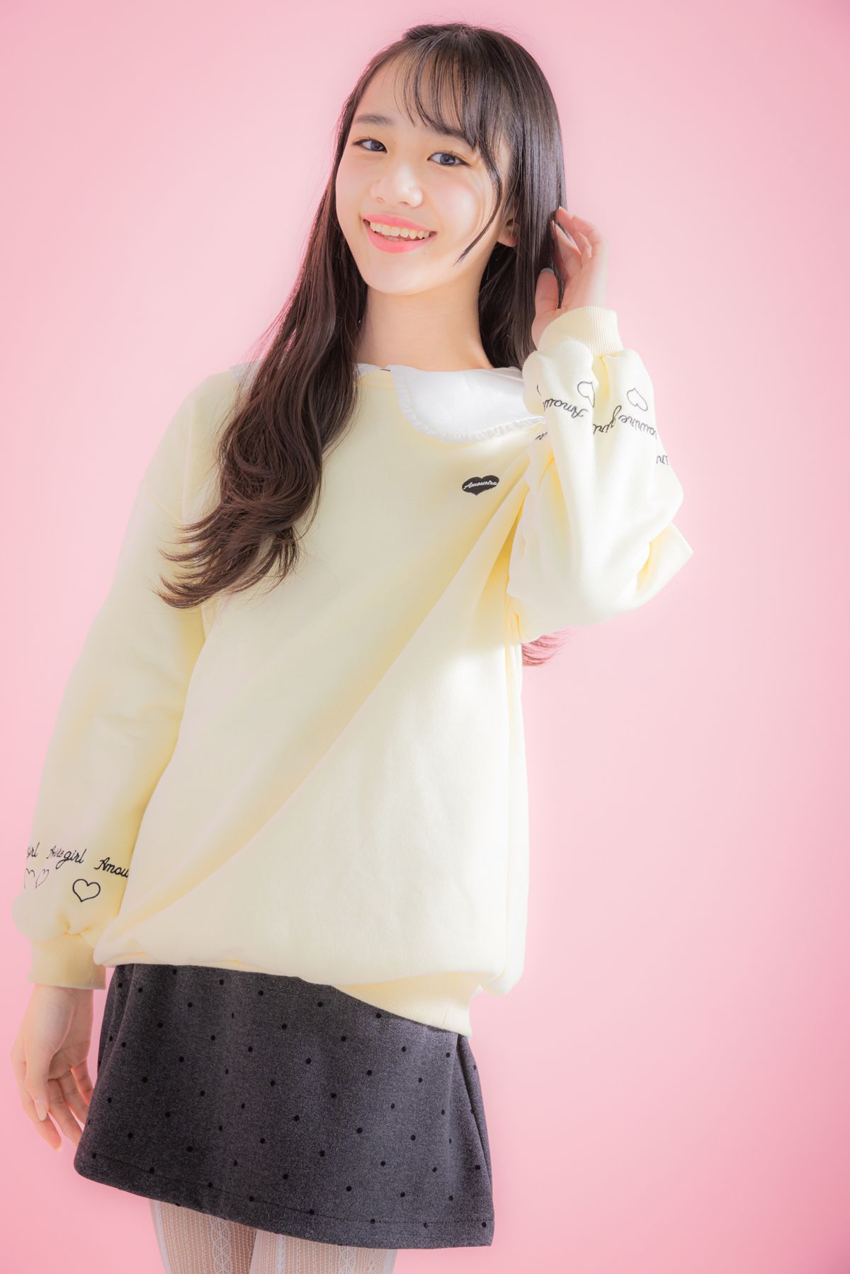 イエロースウェットと白エリトップスをレイヤードするワンテクは必見! ドットミニにレースタイツで足元までガーリー。ちひな☆スウェット¥2290/アムリールガール 襟付きトップス¥3990/GapKids スカート¥1299/グレイル タイツ¥1650/靴下屋(タビオ)