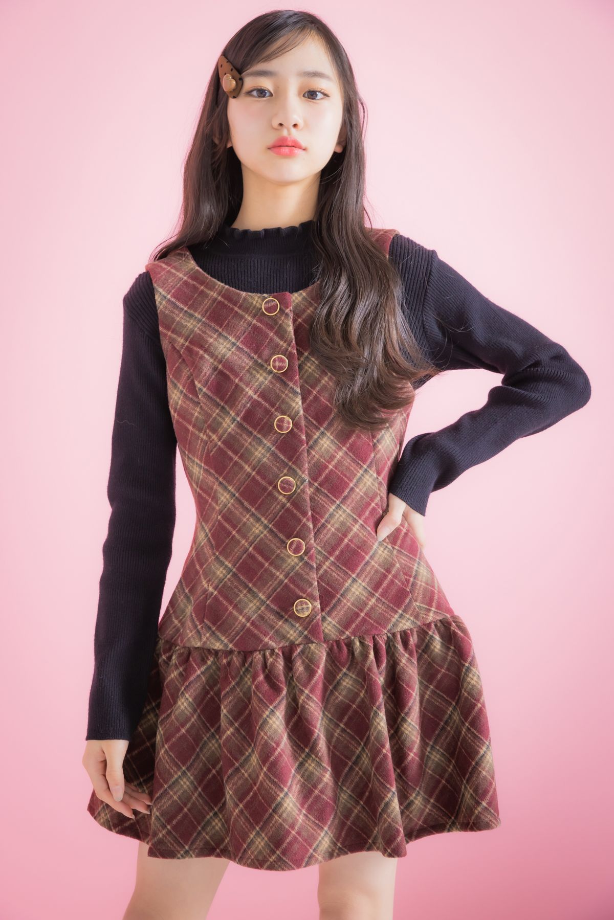 赤チェックのジャンスカでお嬢さまルック!
