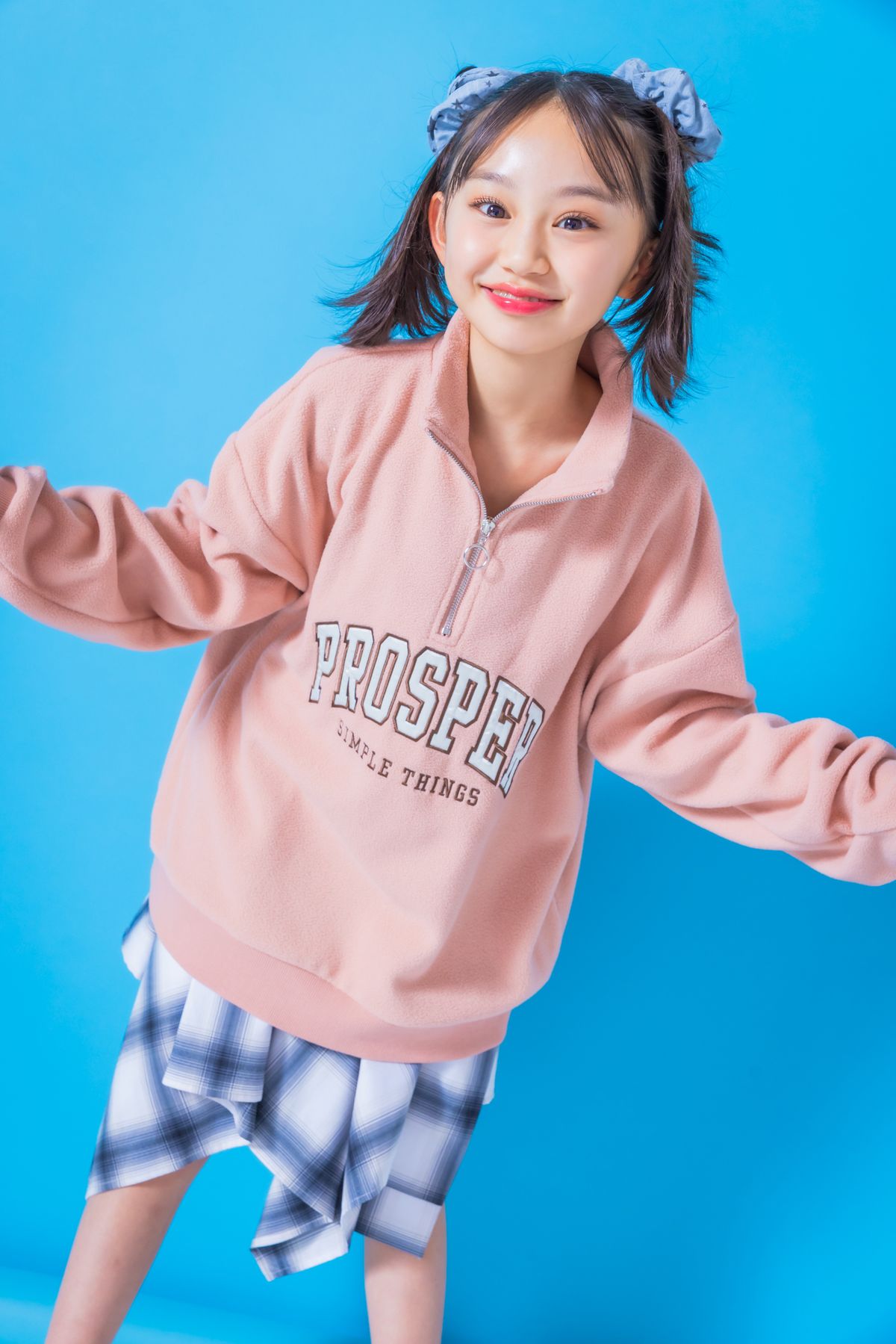 ハーフジップの今っぽなフリースに、変形ミニスカでギャルっぽく! チェックとくすみピンクの相性もバツグン! セイラ☆トレーナー¥4389/ピンク ラテ チェックミニスカート¥2990/ビスキー シュシュ各¥330/ラティス