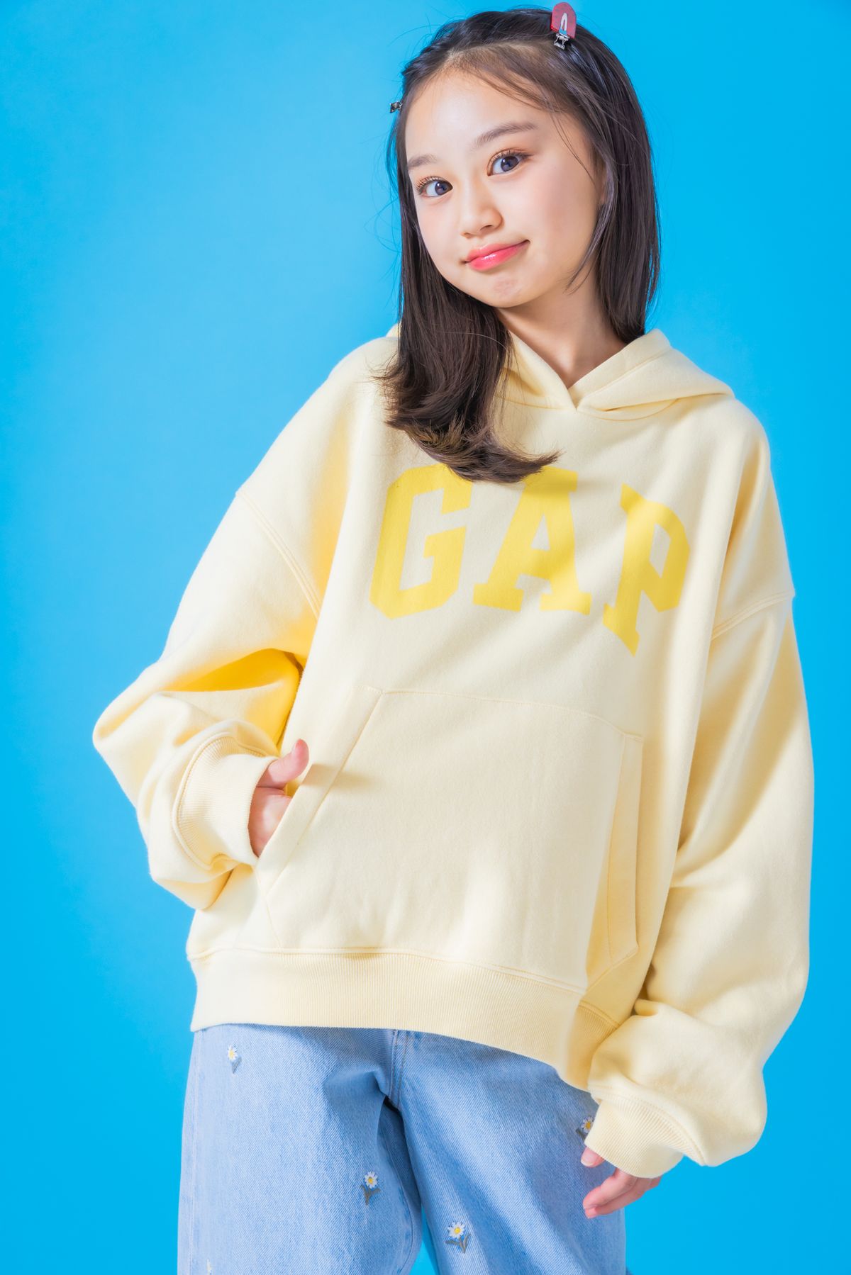 カジュアルに着こなせるスウェットには、パンツの柄をこだわってみて。浅めのデニムカラーにお花のししゅうは1枚でサマになる。セイラ☆スウェット(一部店舗のみでの販売)¥6990、デニムパンツ(一部店舗のみでの販売)¥7990/ともにGapKids ヘアピン(2個セット)¥330/ラティス