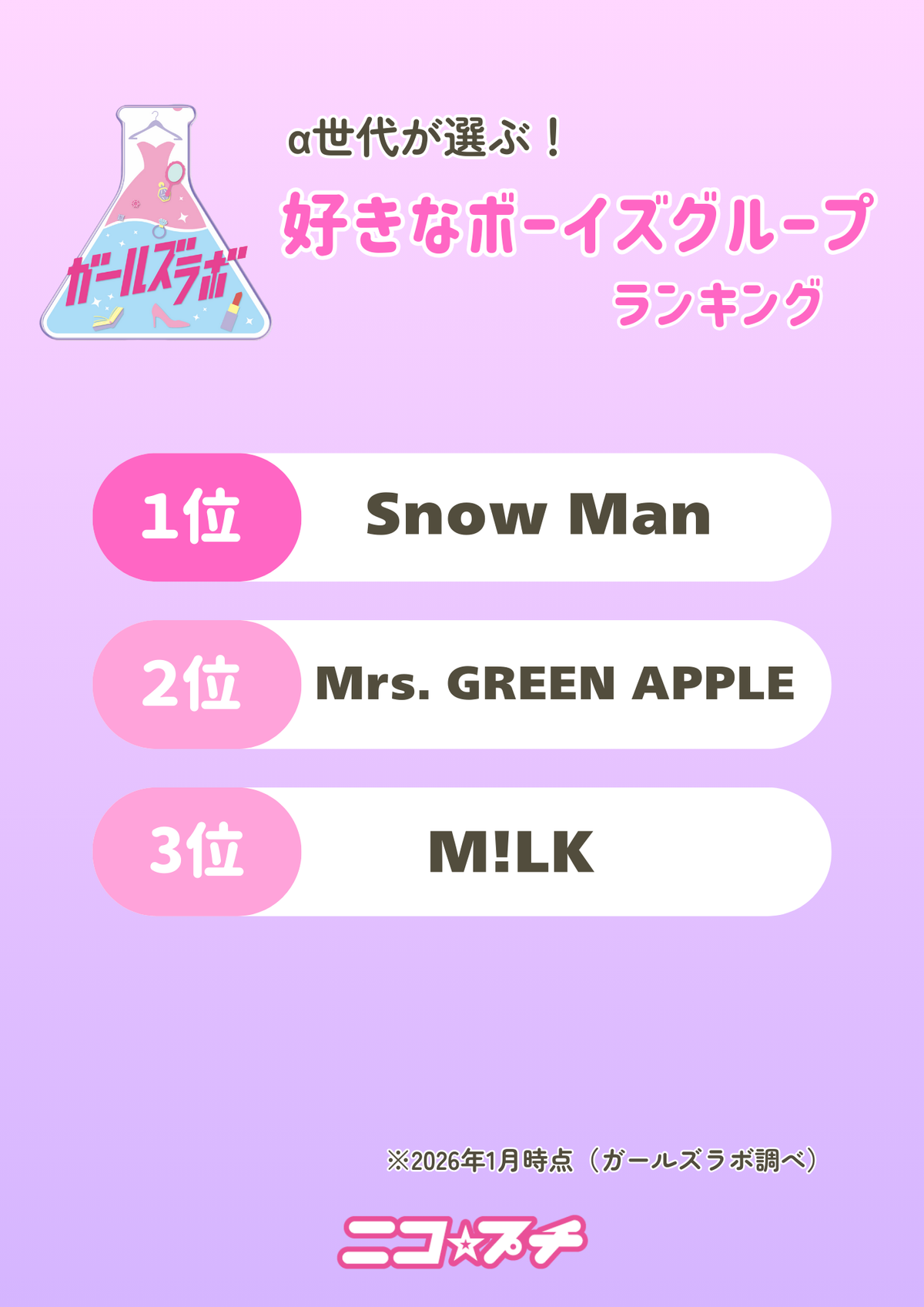 【α世代のトレンドランキング1月編】現役小中学生に聞いた「好きなボーズグループは?」Snow Man、Mrs.GREEN APPLE、M!LK、1位はどのグループ?
