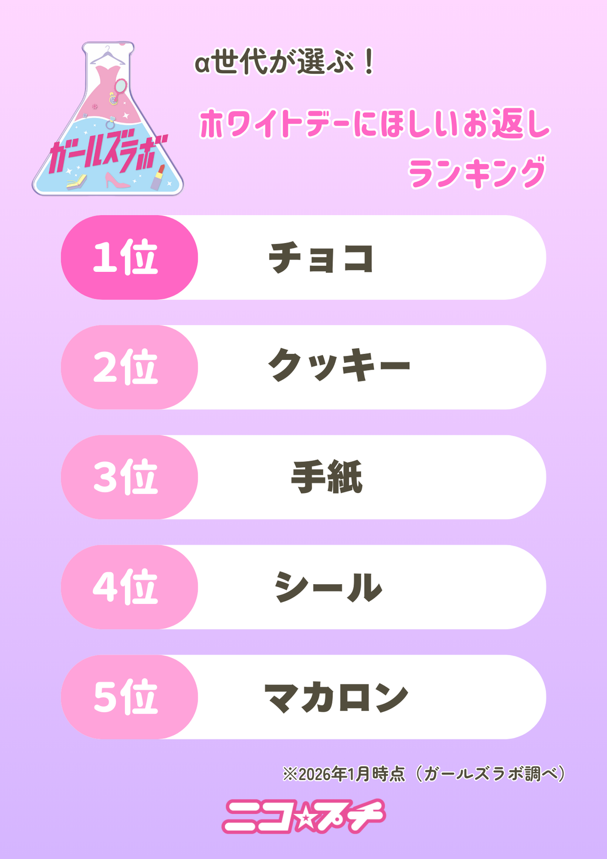 小学生のバレンタイン関連の話題をまとめて発表。バレンタインにあげたいお菓子1位は、まさかのクッキー! 2位〜5位にはチョコ関連がランクイン☆ お返しにはまたまたシールがランクイン! α世代のシール熱すごい♡ バレンタインは結局”友チョコ”が1番重要ってことで、今年もみんなバレンタインを楽しんでね!