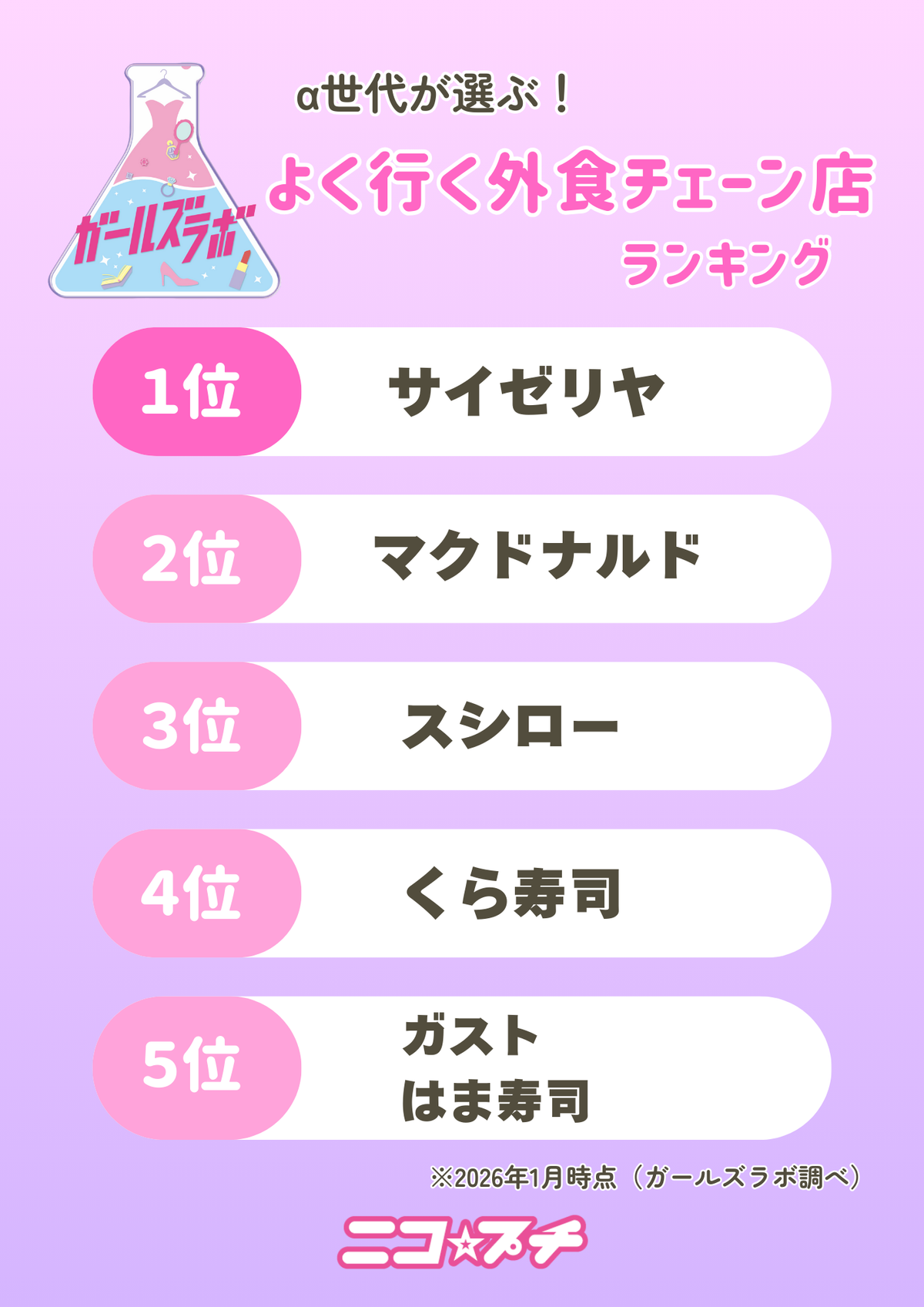 ファミレスといえば王道のサイゼリヤかガストが多いみたい! 友だちとかるーく寄るならマクドナルドなどのファストフードか、回転寿司屋さんが人気☆