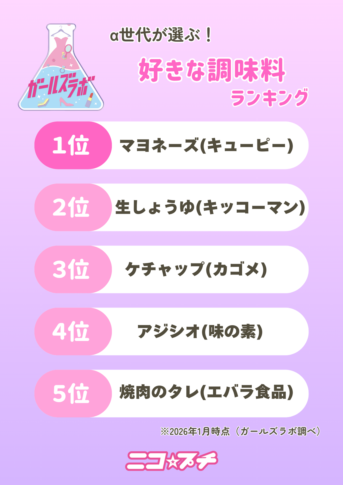 1位〜5位まで全部違うメーカーの調味料がランクイン! 5つともきっと食べたことがあるはず。1位はやっぱり調味料の王様マヨネーズ☆