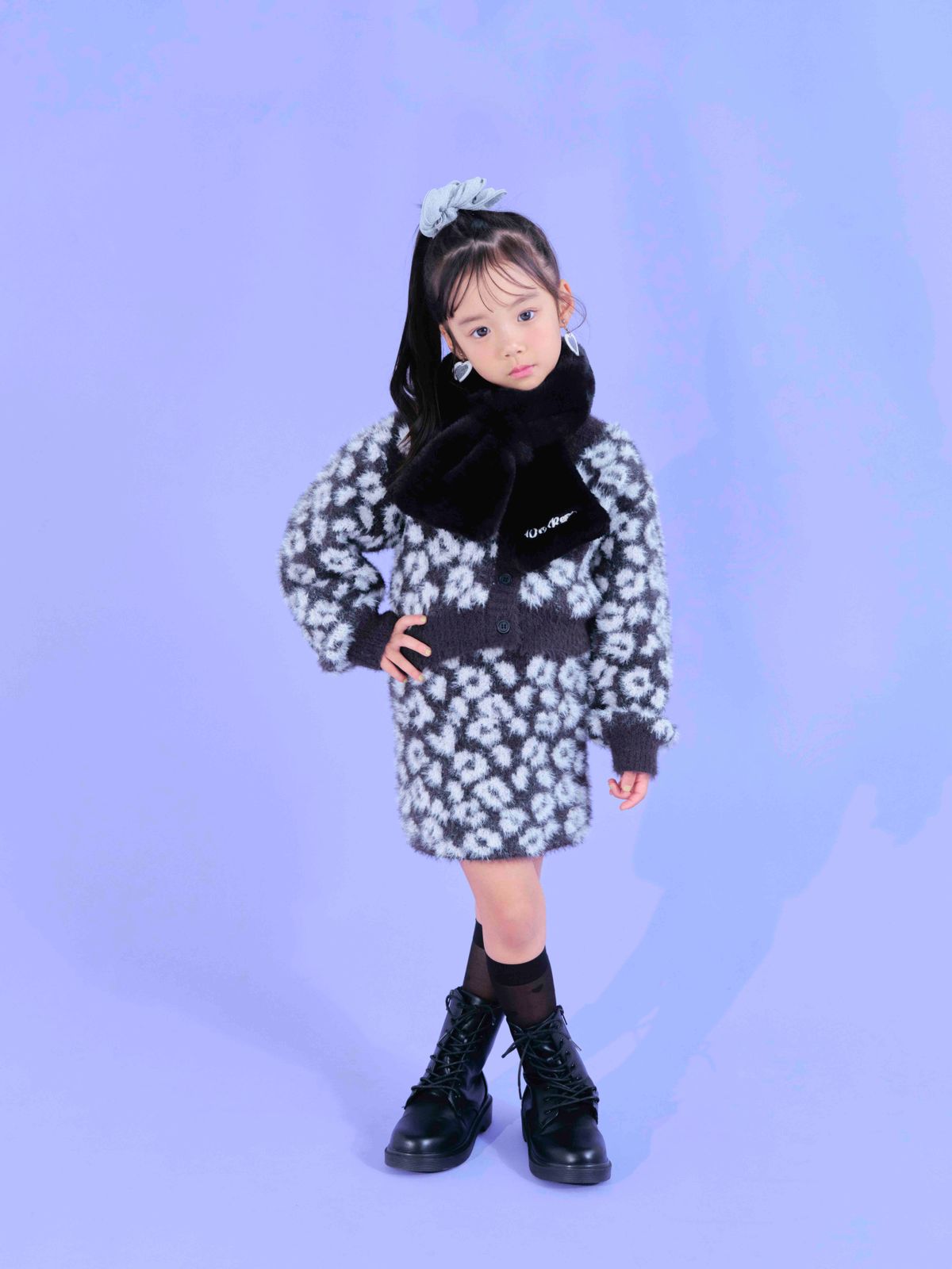 POINT:ふわふわのシャギーであまさをだしたヒョウ柄のセットアップ。タイトめなシルエットも姉ぎゃるポイント♡リョウカ☆カーディガンとスカートのセット¥7150/アナップキッズ シュシュ¥660/パリスキッズ原宿本店 マフラー¥1980、ショートブーツ¥3990/ともにジューシーレピピ イヤリング¥770/ミナキュート(メテオAPAC) ソックス(3足で)¥1180/URBAN CHERRY