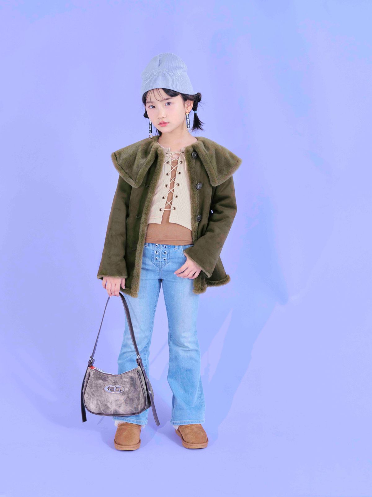 POINT:ヴィンテージライクなアウター×デニムでグランジ感を表現♡ デニムはフレアシルエで脚長効果もアリ!ミマ☆コート¥7150/ビーミング by ビームス(ビーミング ライフストア by ビームス ららぽーとTOKYO-BAY店) レイヤードトップス¥4290/アナップキッズ デニムパンツ¥8990/Gapkids ニット帽¥4950/エックスガール ステージス イヤリング¥330/パリスキッズ原宿本店 バッグ¥4620/アナップガール ムートンブーツ¥3300/オリエンタルトラフィック(ダブルエー)