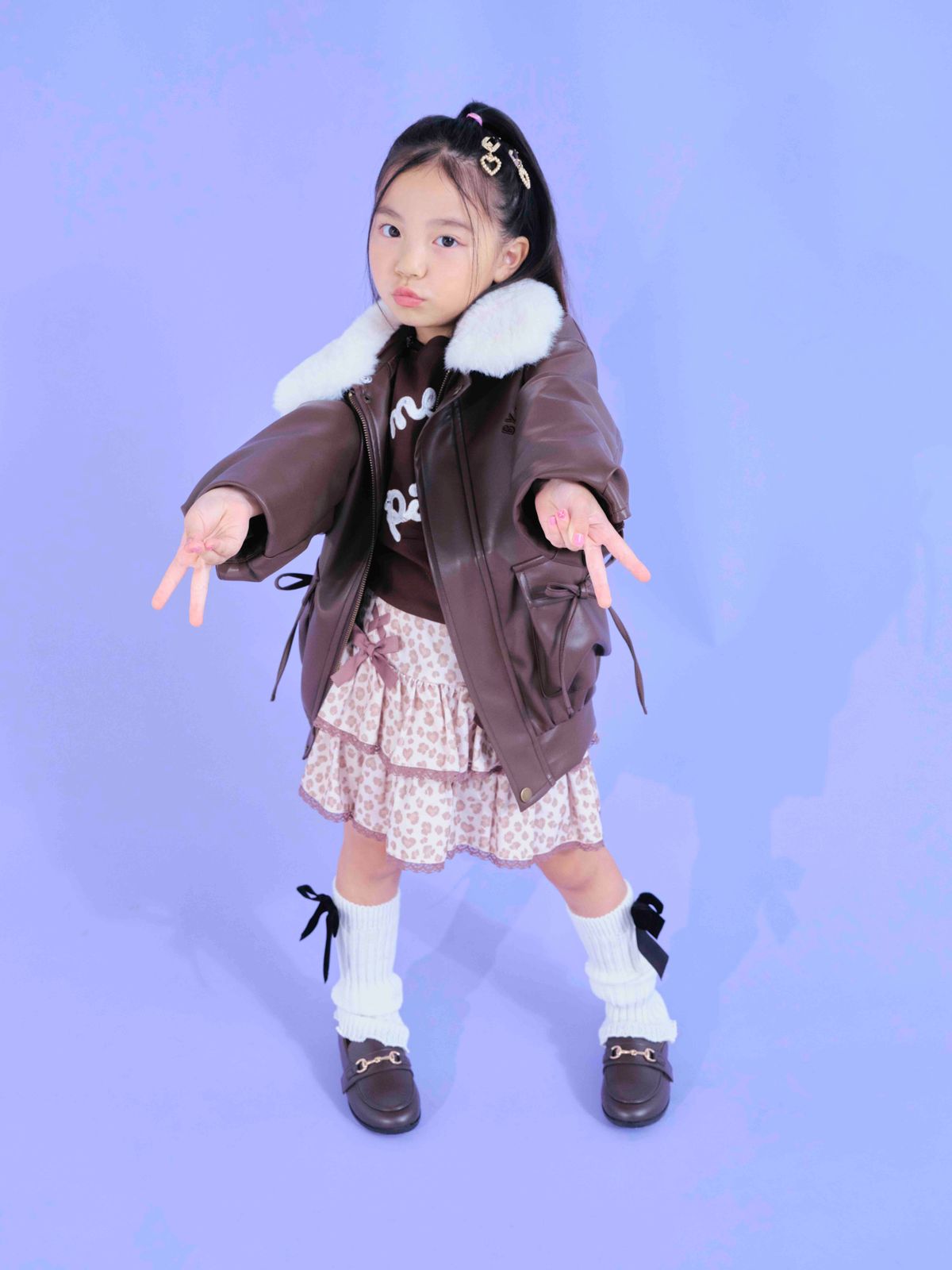 POINT:冬のトレンドカラーでもあるブラウンをつかった、ぎゃるコーデ、ほどよいあまさがかわいくてテンアゲ確実!ヒマリ☆ブルゾン¥9900/バイ ラビット スウェット¥12980、スカパン¥14300/ともにメゾ ピアノ ヘアピン(2個セット)¥1100/OSAWEYA(お世話や) チョーカー¥550/パリスキッズ原宿本店 レッグウォーマー¥770/リセマイン ローファー¥4200/オリエンタルトラフィック(ダブルエー)