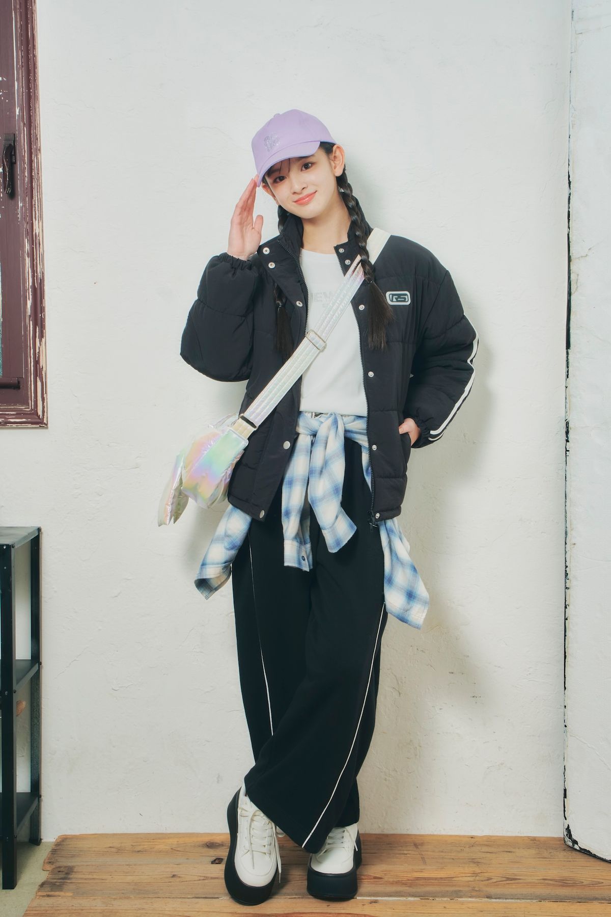韓国アイドルの練習生を意識したブラックコーデ。チェックシャツを腰に巻けば、こなれ感もでまくりです☆ヒナちゃん☆ブルゾン¥7590/アナップガール ロンT¥6050/ニューエラ キャップ¥3190/アナップ キッズ スニーカー¥6490/アナップガール 腰に巻いたシャツ¥5990/Gapkids パンツ¥2990/ビスキー バッグ¥9790/メゾ ピアノ ジュニア