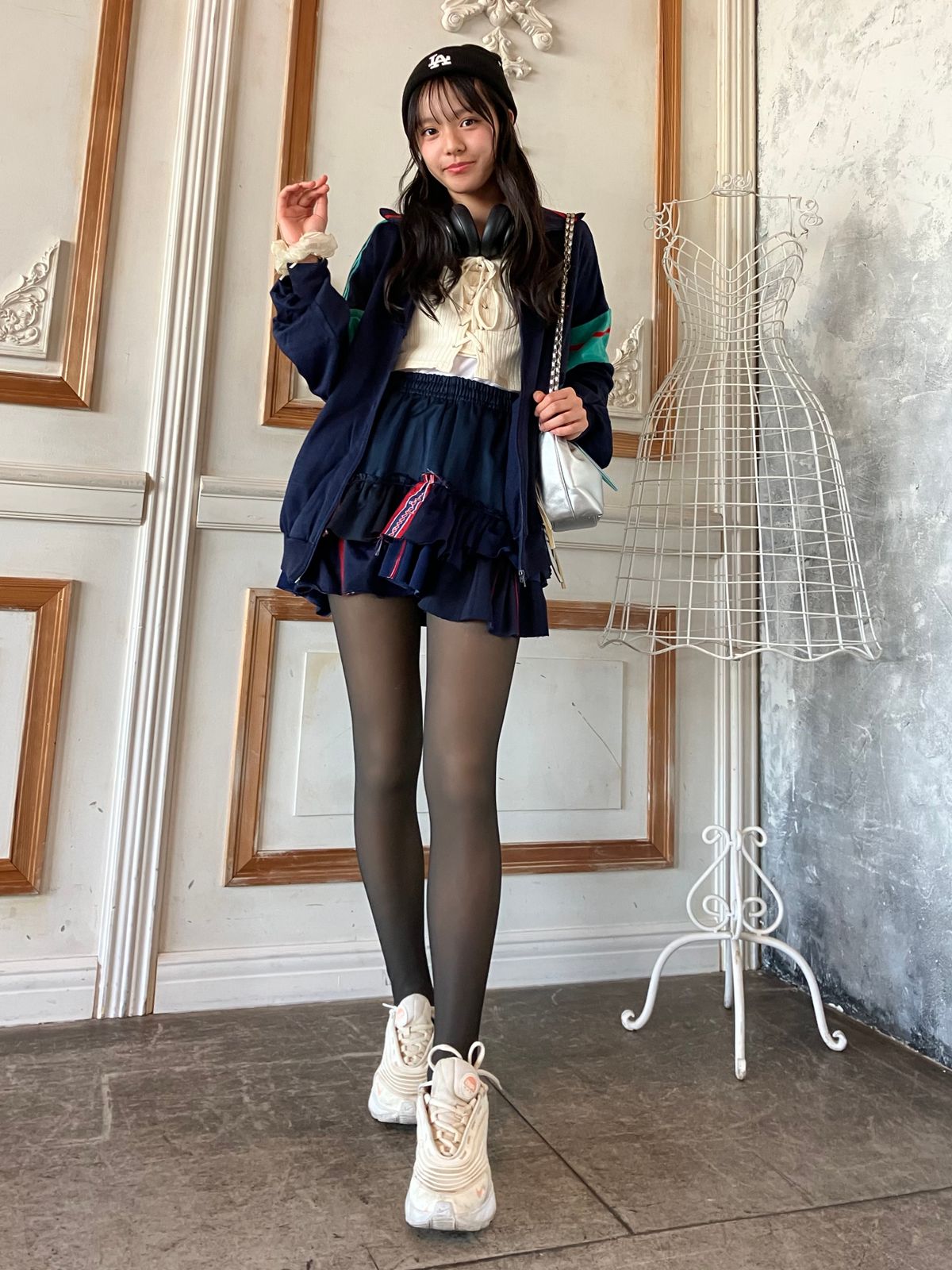 アディダスのブルゾンと古着屋さんで見つけたフリルスカートが、素材と色味が似ていてセットアップっぽく着れた♡ スポブランド多めで、ラフなストリート感を意識してみたよ!