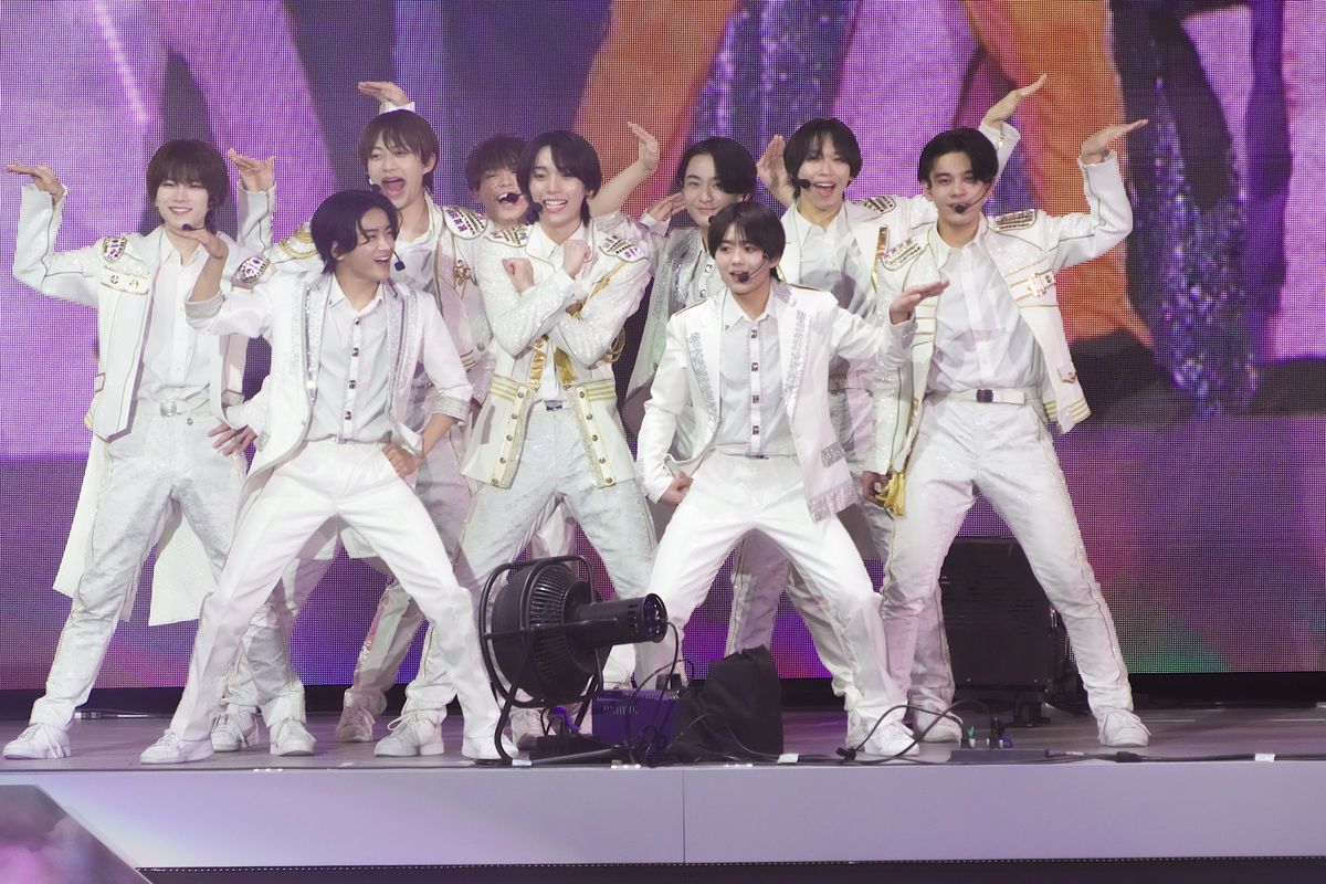 そしていよいよ本番! 横浜アリーナのステージから、まずは昨年2月に結成されたACEes、KEY TO LIT、B&ZAIがグループごとに会場を盛り上げていきます! 唯一無二のみりょくを持った3組のパフォーマンスを終えると……世代を超えて大人気の楽曲、嵐の「Happiness」へ♪ ダイア、ソウ、ライの出番はこの曲からステージへ登場したよ。中央ステージでピンクの衣装を着て、フレッシュジュニアのみんなと元気いっぱいパフォーマンス! 3人も会場をいっしょうけんめいに盛り上げようと、花道を歌っておどりながらかけぬけます☆さらにB&ZAIの7人と関西ジュニアの嶋﨑斗亜くん、西村拓哉くん、大西風雅くん、岡﨑彪太郎くん、永岡蓮王くん、山中いつきくん、井上一太くん、渡邊大我くんが登場。関西らがコラボした「なつ♡あい」には、ダイア、ソウ、ライも参戦。黄色×白色の衣しょうを着て、B&ZAIの皆さんの前でかわいい振り付けを全力ひろう! 両手をグーにして、かかんで腰をくねらす3人。楽しくハッピーな曲を笑顔をふりまきながら、ダンス、ダンス、ダンス!