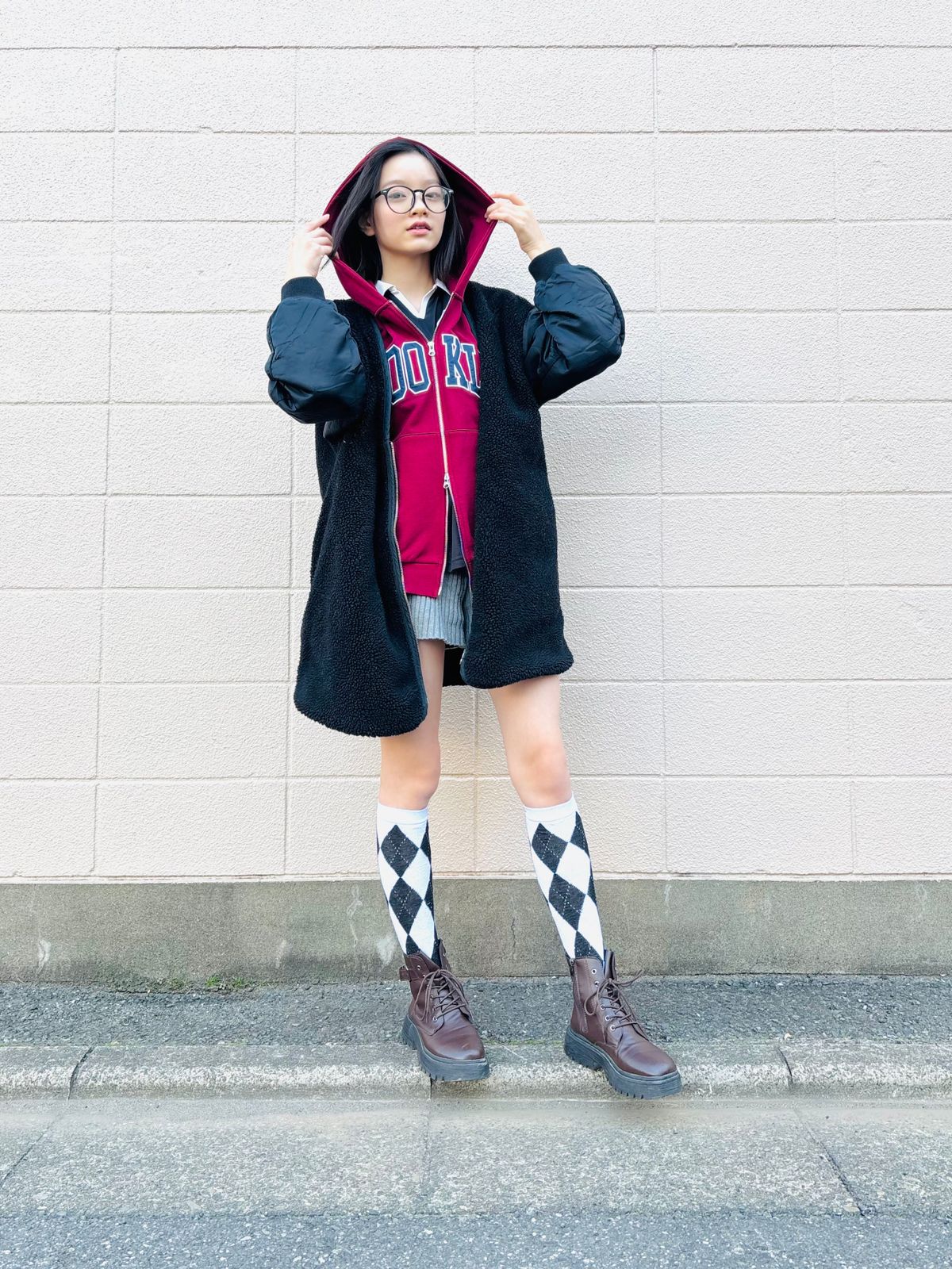 パーカー:WEGO トップス:レピピアルマリオ ボトムス:GRL アウター:Lee ソックス、ブーツ:SHIEN メガネ:WEGO
