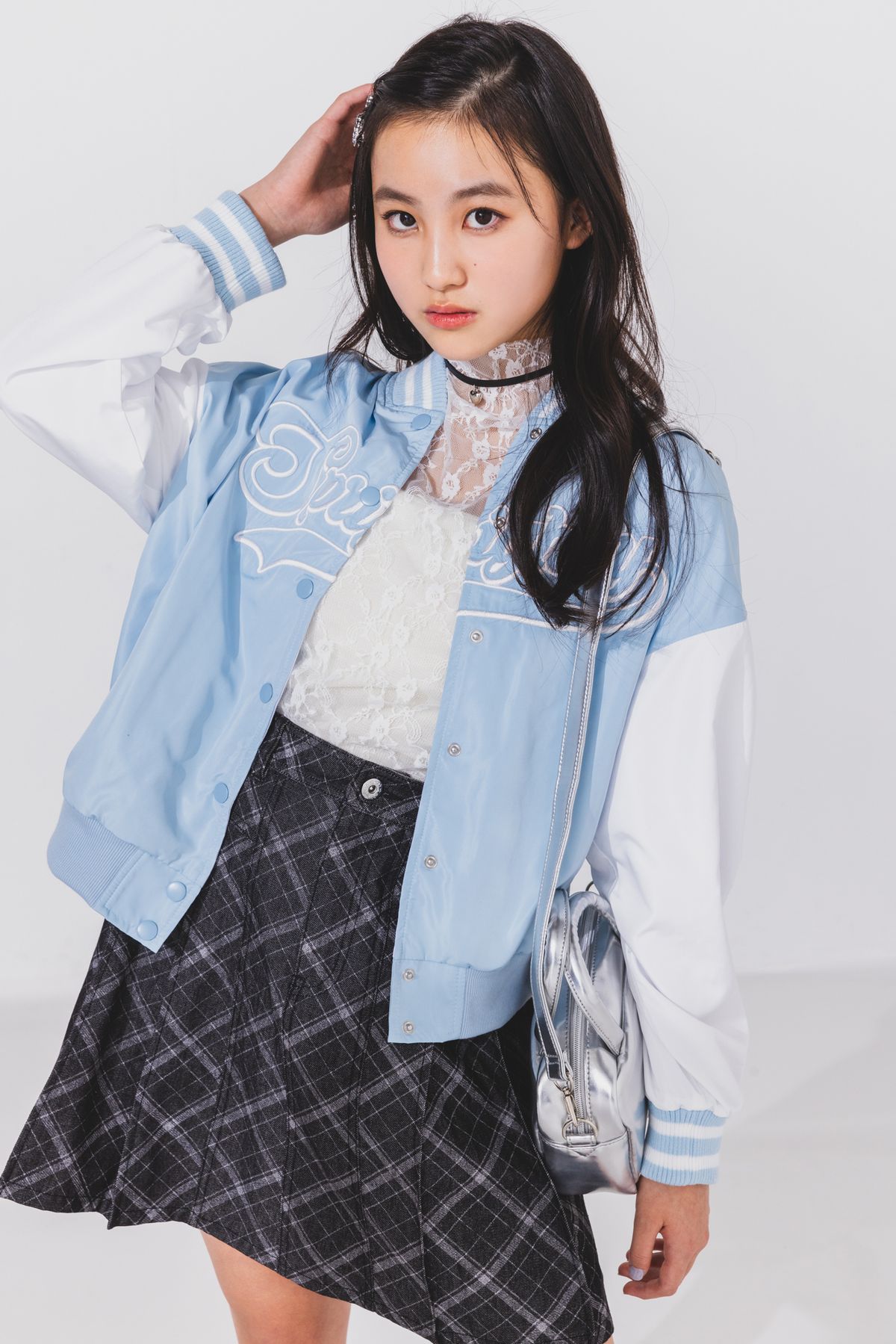 ありさ☆スタジャン¥3490/ビスキー トップス¥1980/URBAN CHERRY プリーツスカート¥14190/ポンポネット ジュニア ヘアピン¥1100、チョーカー¥880/ともにパリスキッズ原宿本店 バッグ¥3990/ピンク ラテ ハイソックス¥880/靴下屋(タビオ) スニーカー¥15400/プーマ