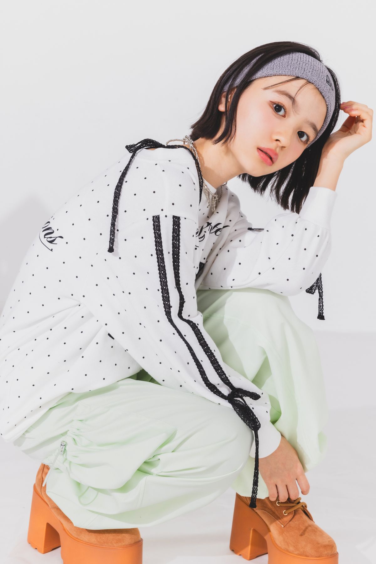 ドットトップスに、スポーティなカーゴで甘辛なミックス感☆ 色はパステルをふんだんに使って、ヘアバンドでカジュアルさをアピって!