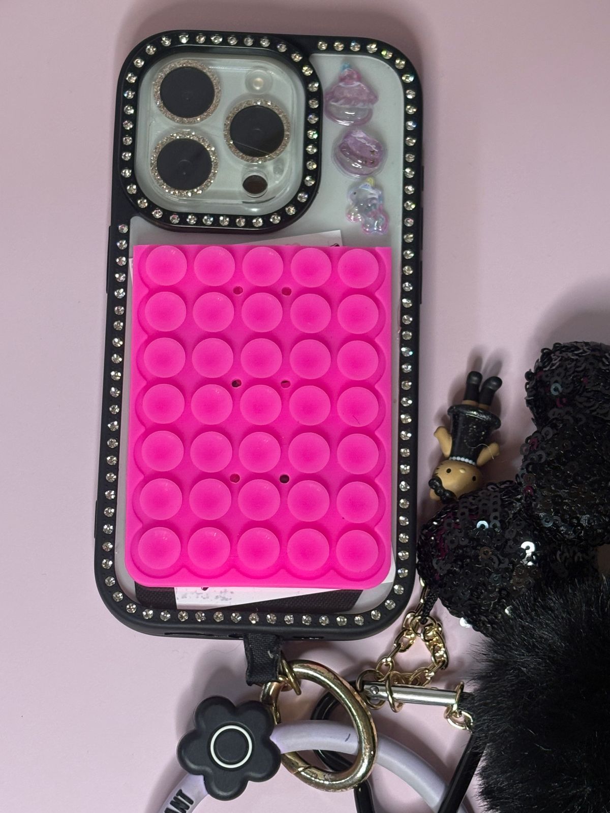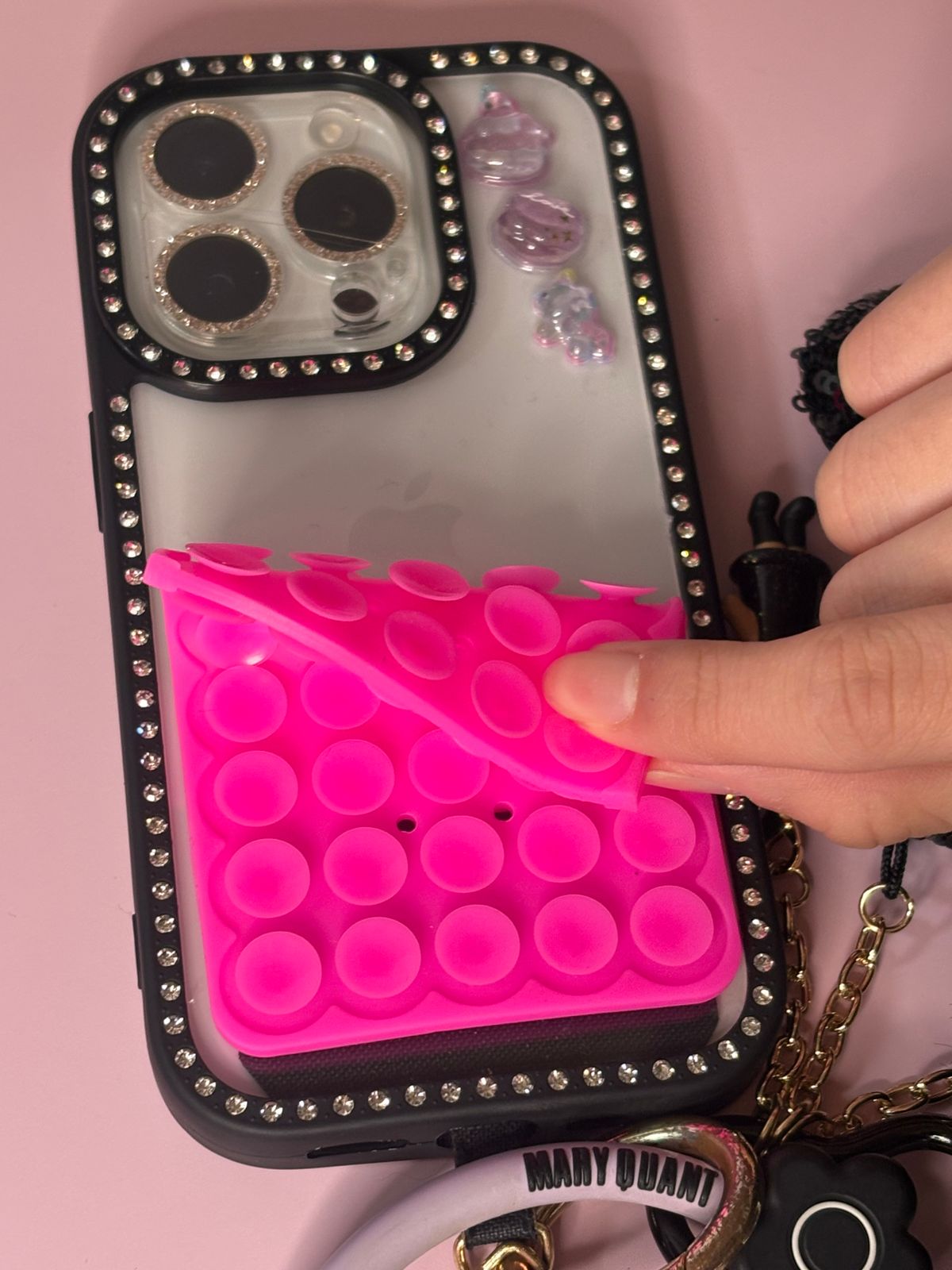 スマホの後ろにつけて使っています📱壁などに張り付けて自撮り出来たり本当に便利です!私は両面とも吸盤タイプにしました!!吸盤シートのサイズがちょっと大きかったので、切って使っています♡